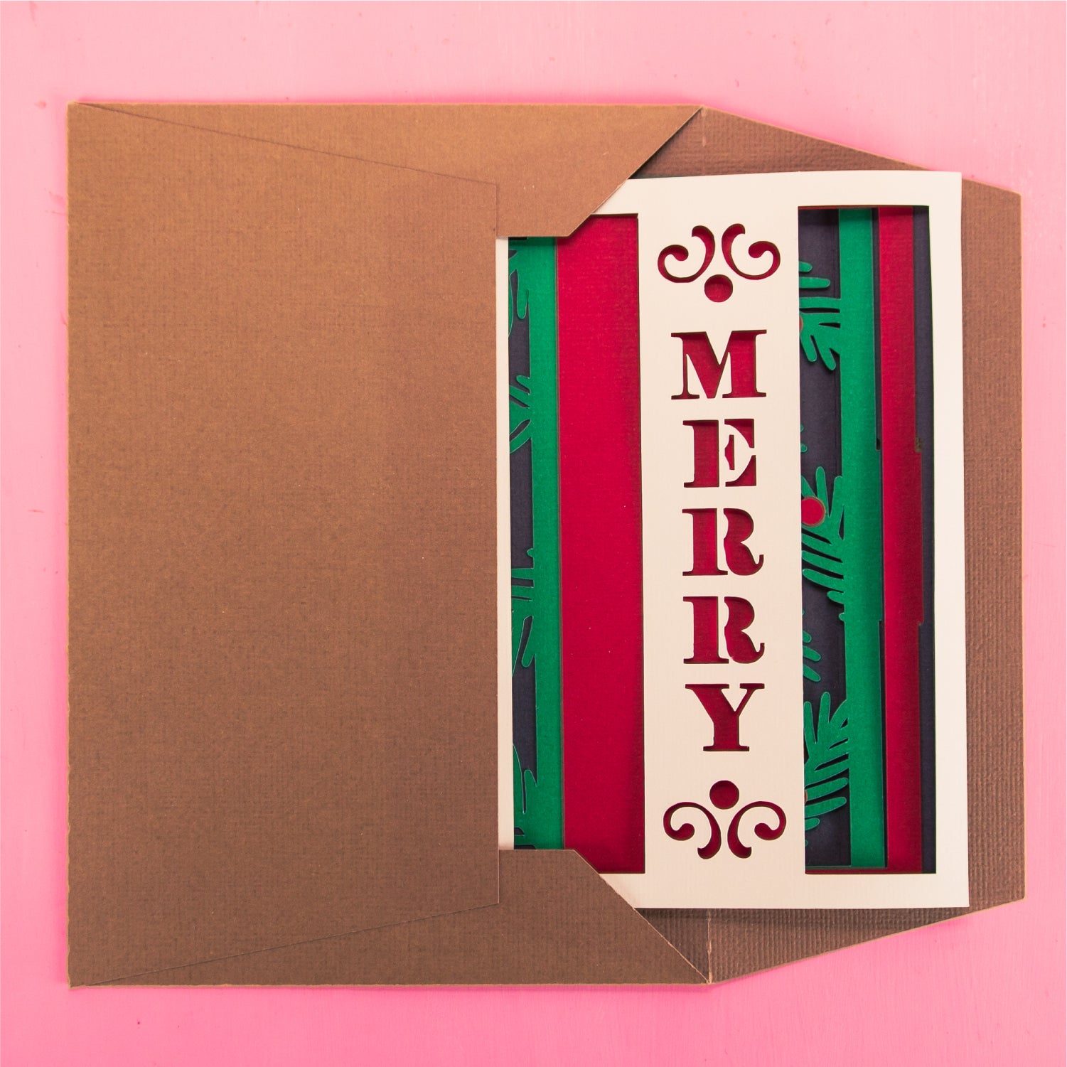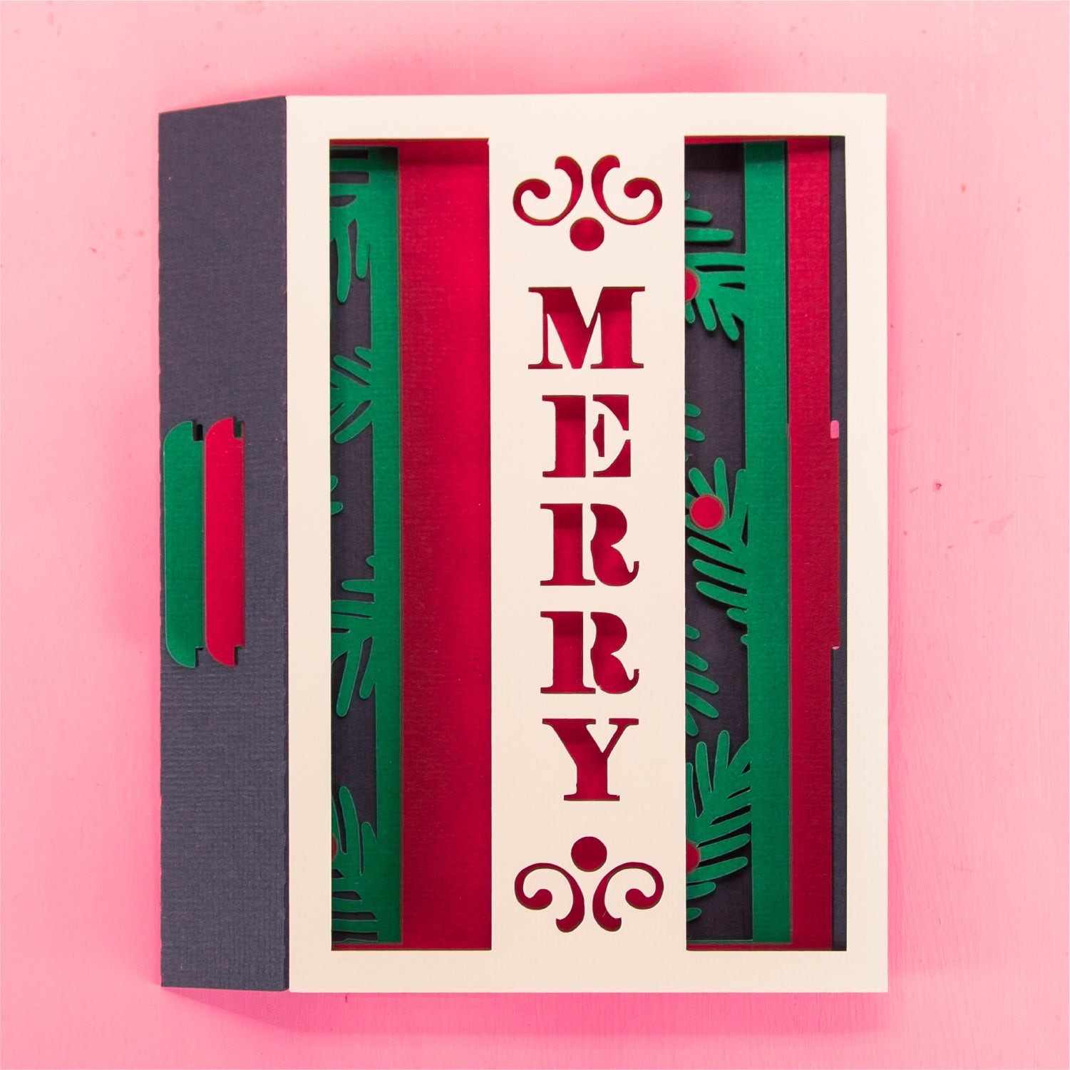 Create a classic card for Christmas with this 'Merry' layered paper card design - a 3D Christmas card SVG! This is a layered design, with the word 'Merry' with some pine branches and berries in the background. This cutting file is perfect for Cricut and Silhouette cutting machines. The card folds flat for easy mailing and fits perfectly in the included 5x7” envelope cut file. Explore more of my card designs for even more cute and creative Christmas papercraft ideas!