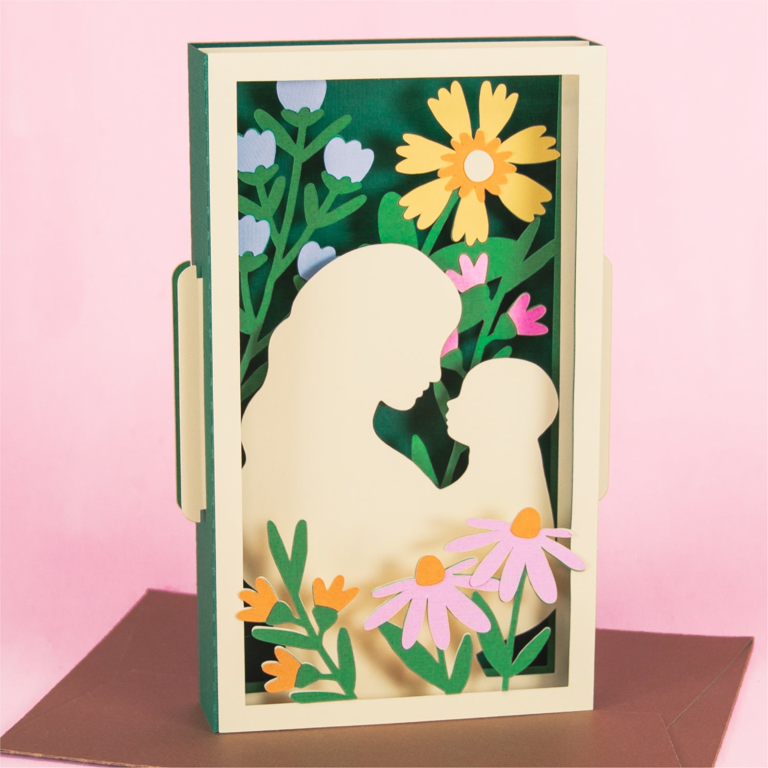 Create a beautiful card for Mother's Day with this Mom & Baby Card with Flowers - a 3D Mother's Day card SVG! This is a gorgeous card for Mother's Day, a baby shower, or to welcome a new baby to the world. I love updating the cardstock colors to match mom's favorite flowers! This cutting file is perfect for Cricut and Silhouette cutting machines. The card folds flat for easy mailing and fits perfectly in the included 5x7” envelope cut file. Explore more of my card designs for even more cute and creative ideas!