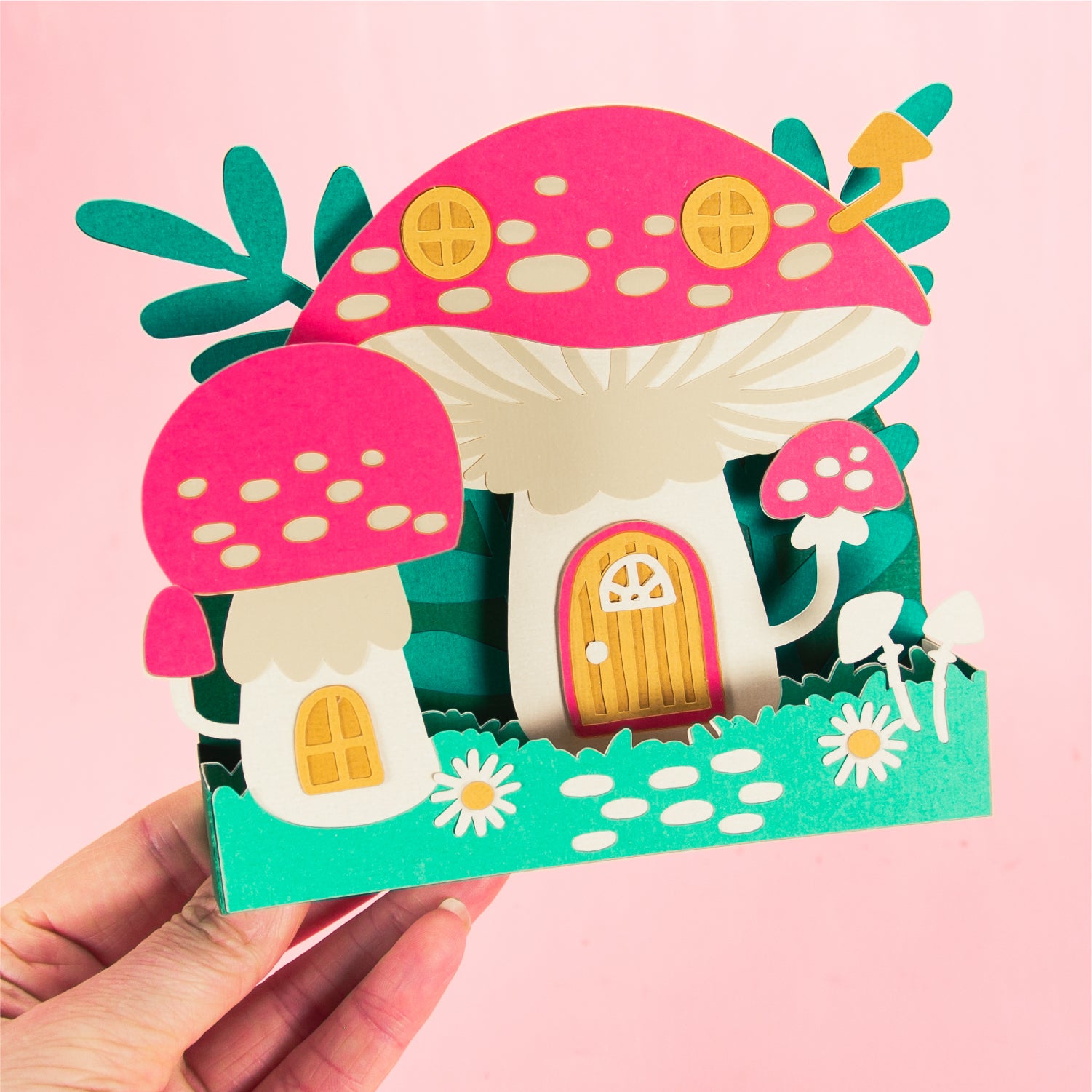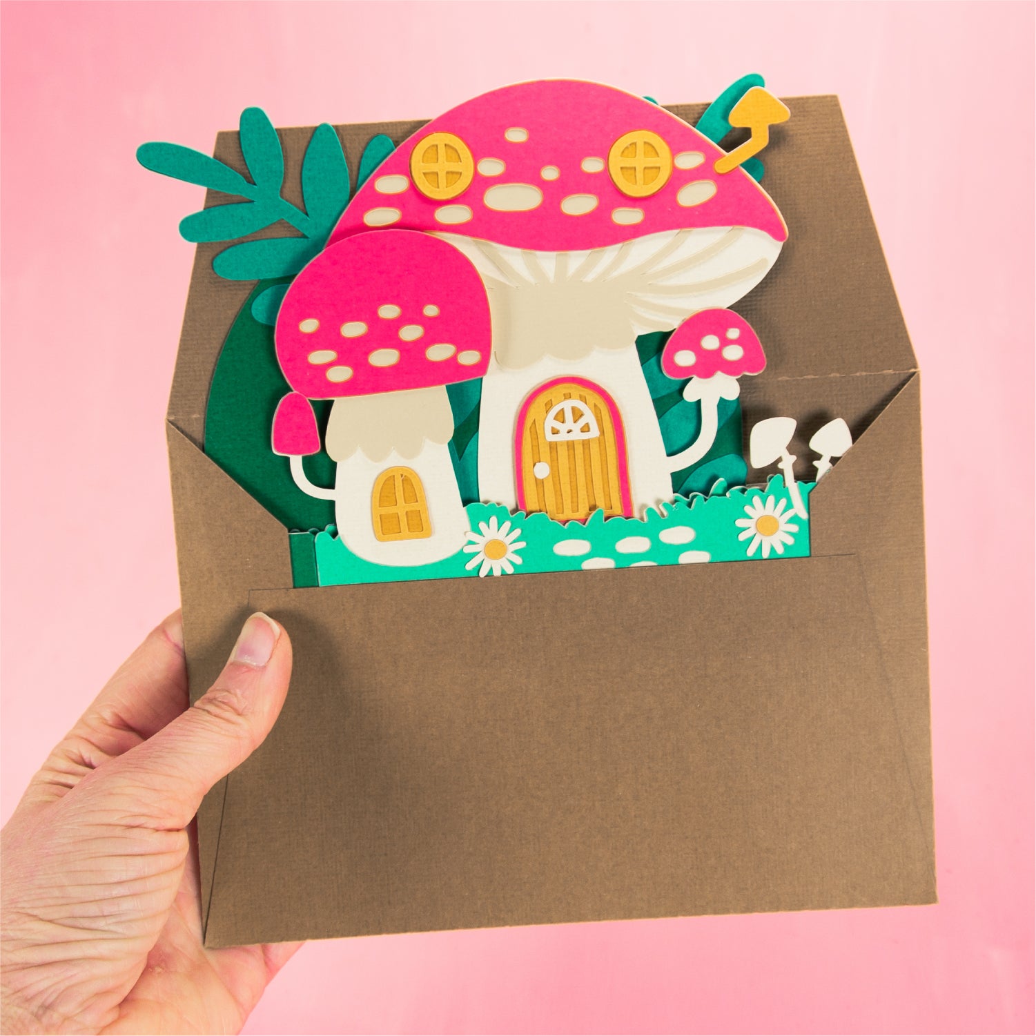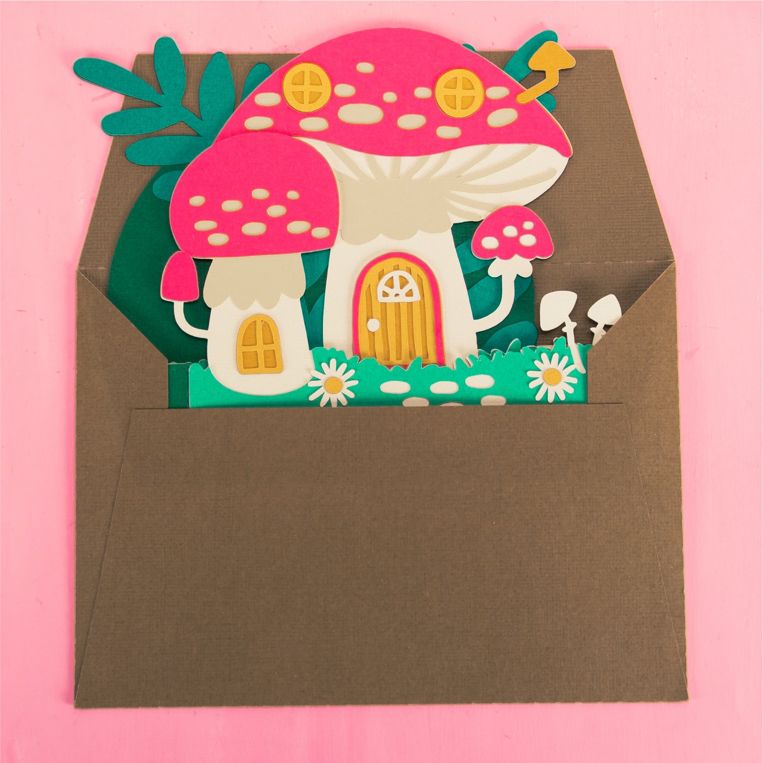 Create the cutest fall card with this Mushroom House Card - a 3D Autumn Card SVG! Featuring a home made out of mushrooms, this cutting file is perfect for Cricut and Silhouette cutting machines. The card folds flat for easy mailing and fits perfectly in the included 5x7” envelope cut file. This design would work great for a birthday, a thank you card, or just because! Change the color of the windows and doors for a more customized look (I think purple would look great), and add your own words to the front! Explore more of my designs for even more cute and creative papercraft ideas!