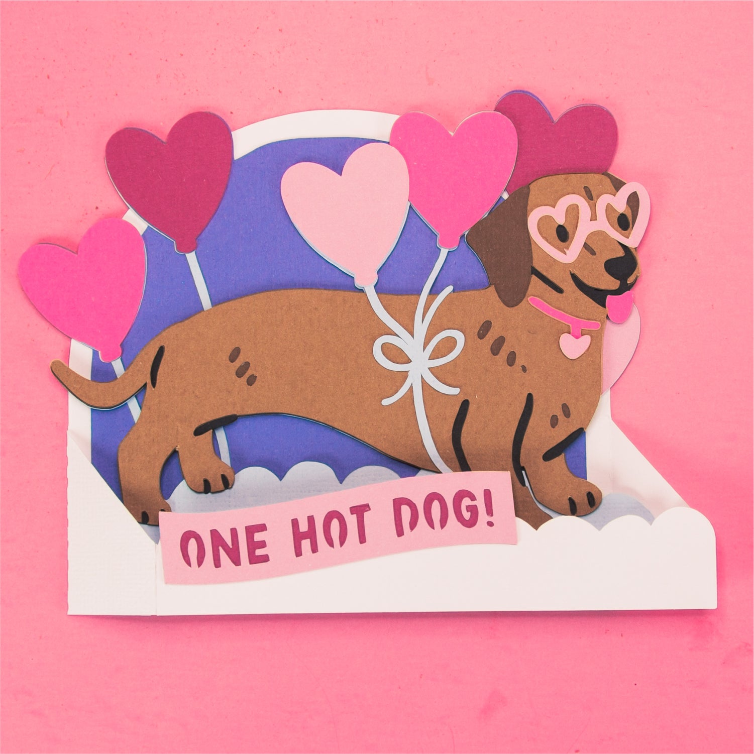 Create an adorable Valentine's Day card with this One Hot Dog - Dachshund Card, a Valentine's Day SVG! This design features a wiener dog in heart glasses, in front of some colorful heart balloons. This design includes the optional phrase 'One Hot Dog'. I love this one for Valentine's Day, an anniversary, or for a new pet! I'd love to see the balloons in a patterned or glitter cardstock! This cutting file is perfect for Cricut and Silhouette cutting machines. This design folds flat for easy mailing and fits perfectly in the included 5x7” envelope cut file. Explore more of my card designs for even more cute and creative papercraft ideas!
