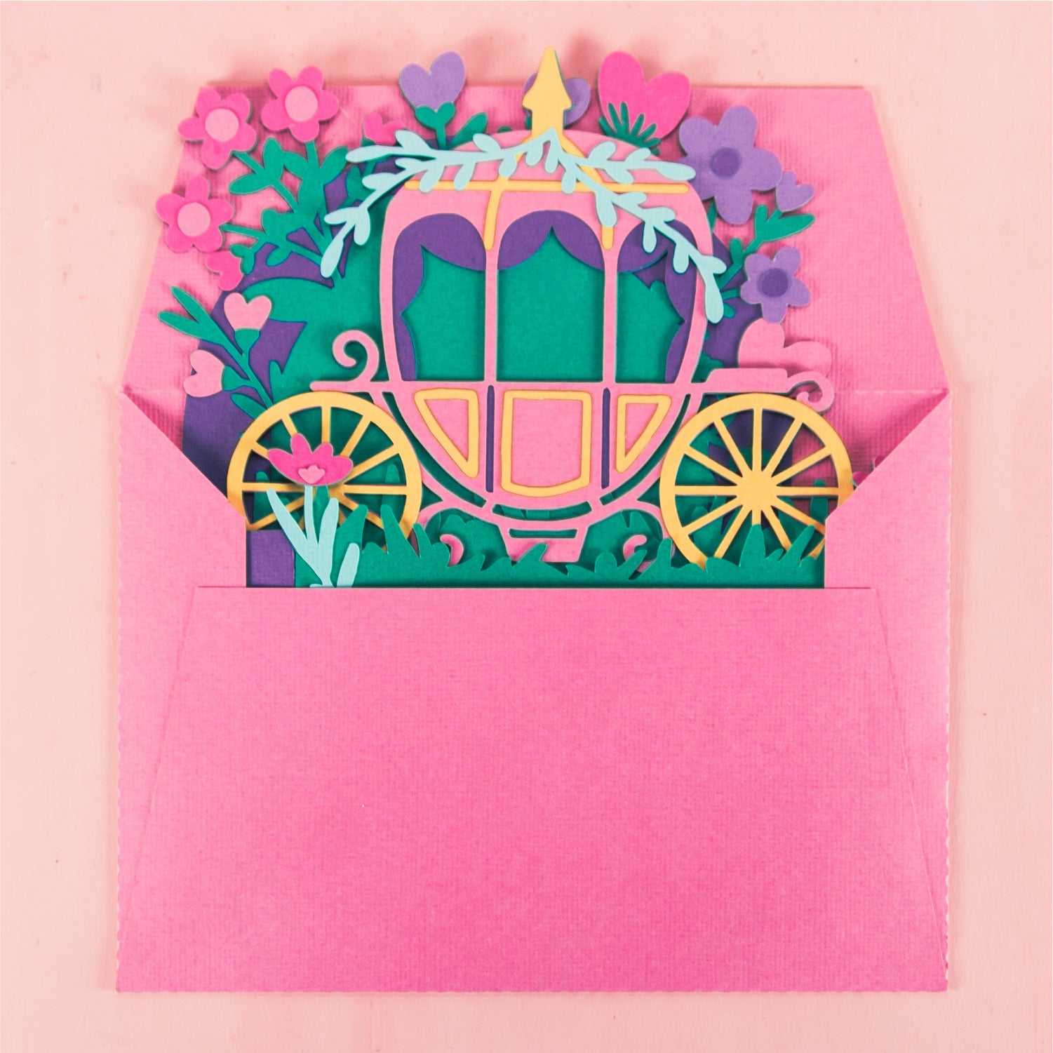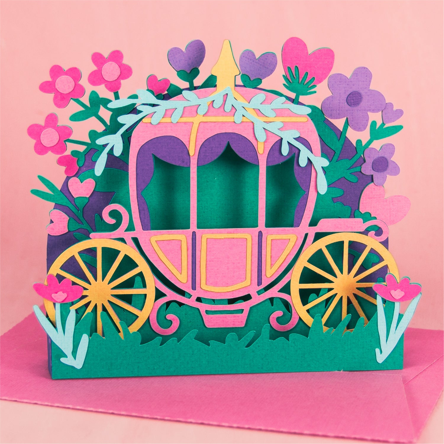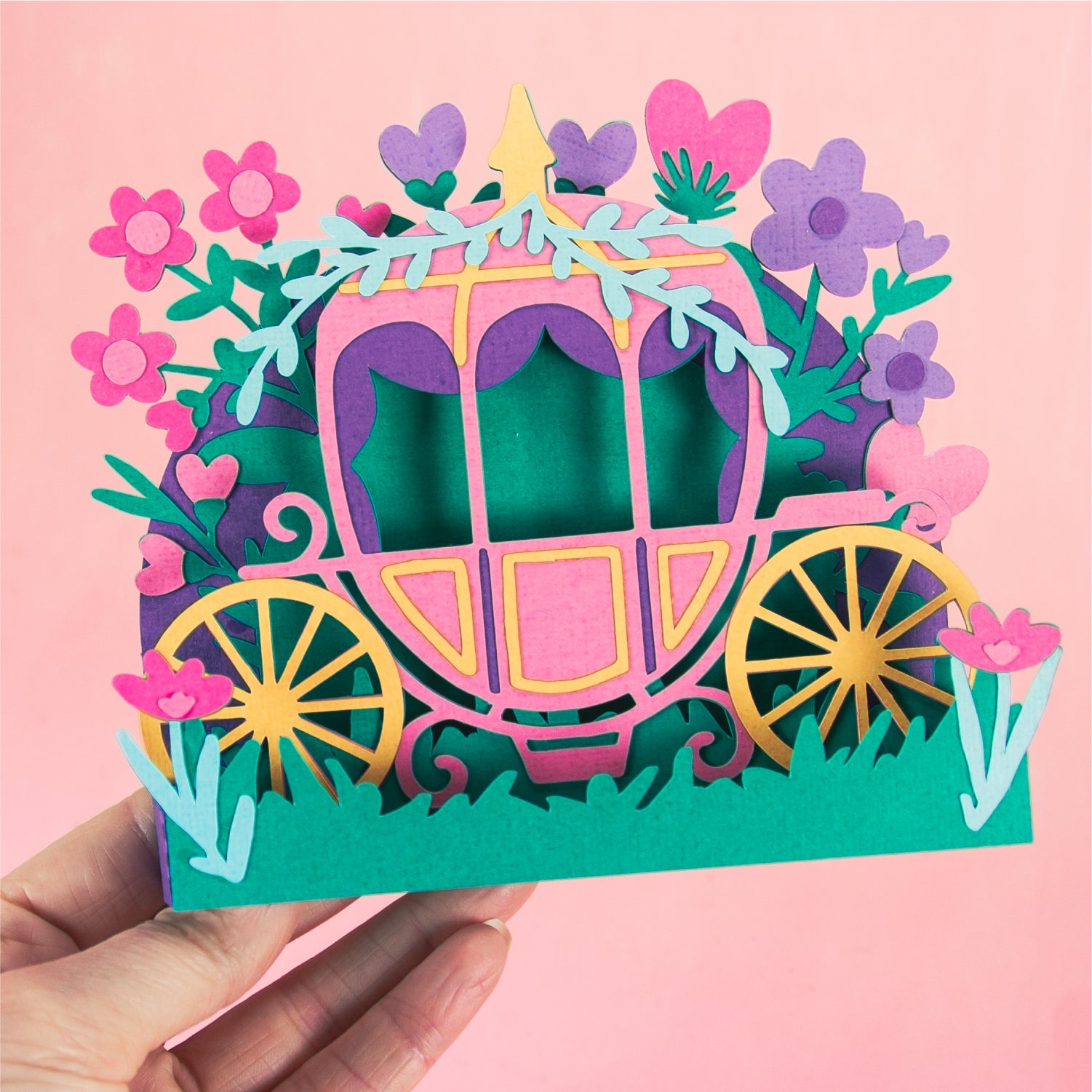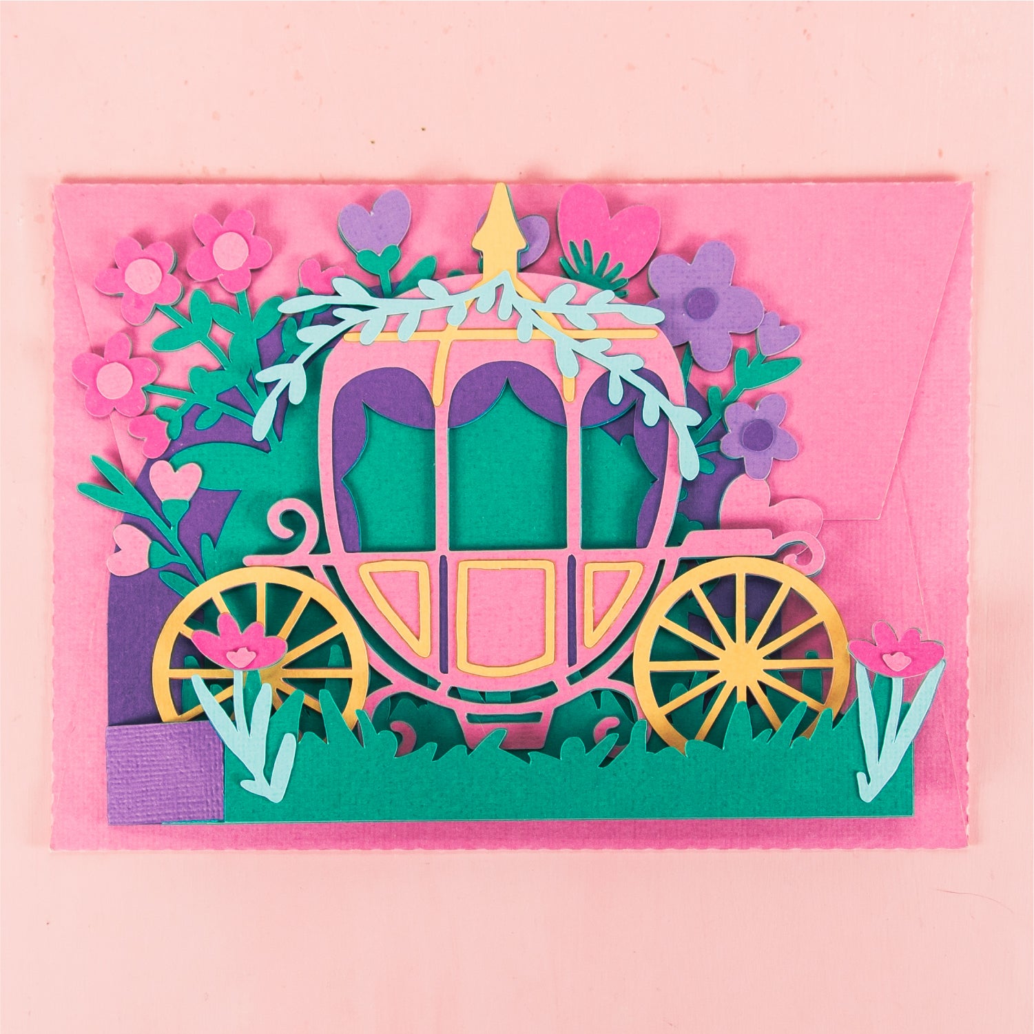 Create the cutest birthday card with this Princess Carriage Card - a 3D any occasion card SVG! This is such a sweet card for your favorite princess - your daughter, granddaughter, niece, sister, or friend! I love this one for a birthday, as a congratulations card, or for any occasion. This design features a princess carriage surrounded by flowers. I love the idea of using gold glitter cardstock for the wheels & details! This cutting file is perfect for Cricut and Silhouette cutting machines. The card folds flat for easy mailing and fits perfectly in the included 5x7” envelope cut file. Explore more of my card designs for even more cute and creative ideas!