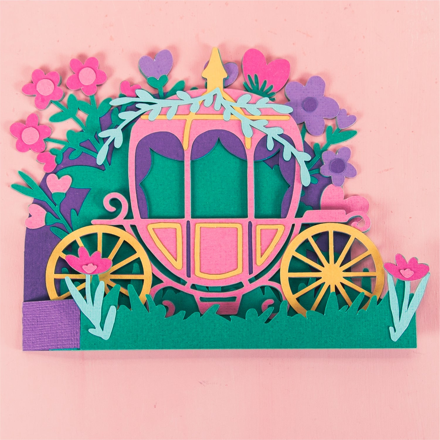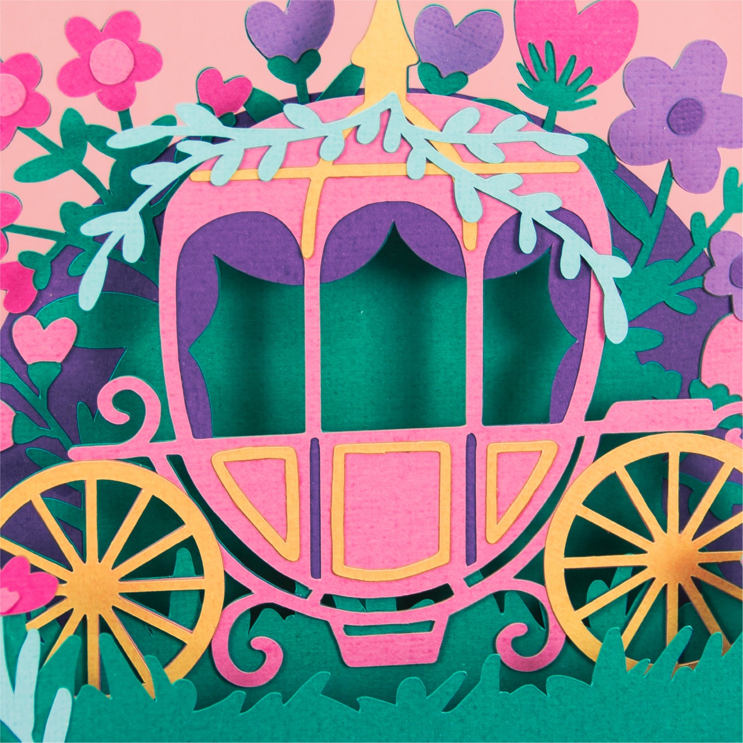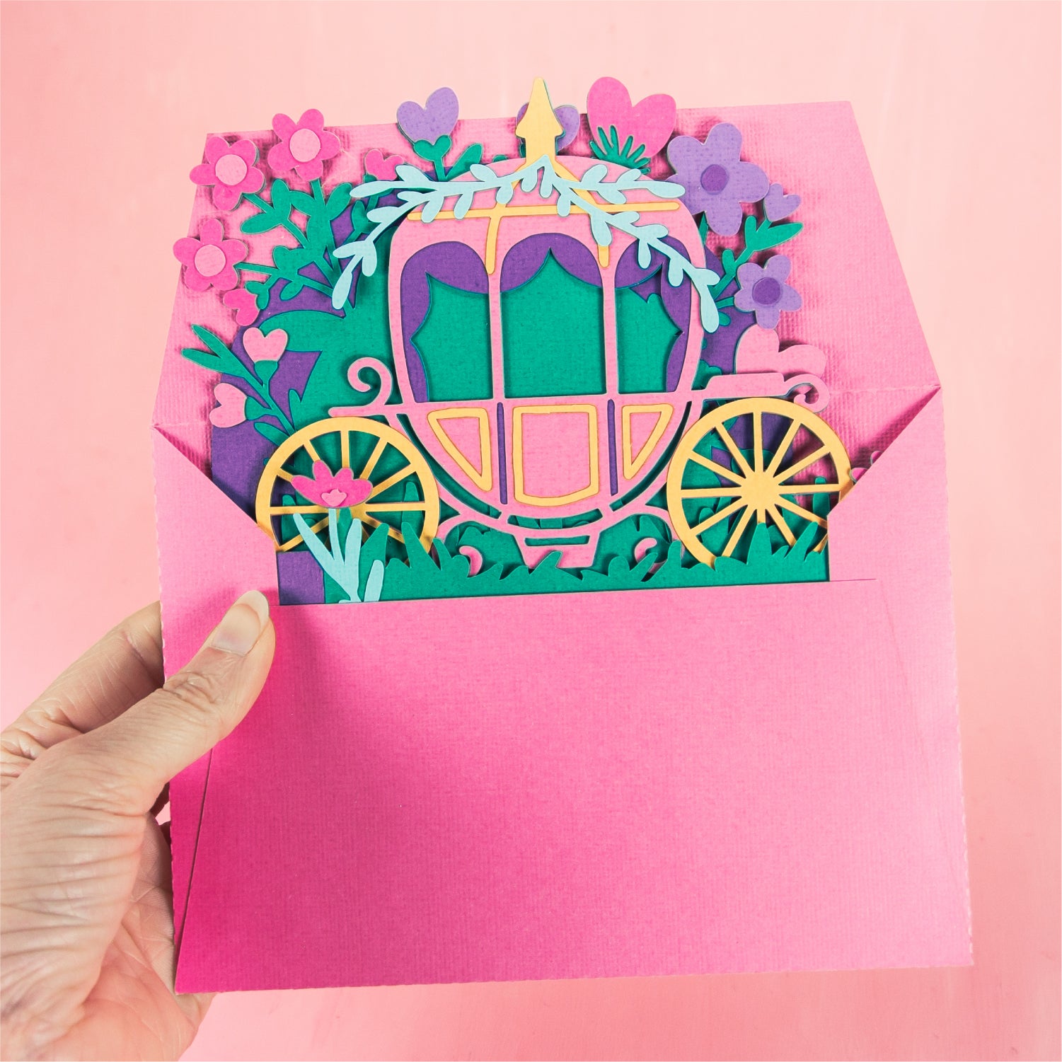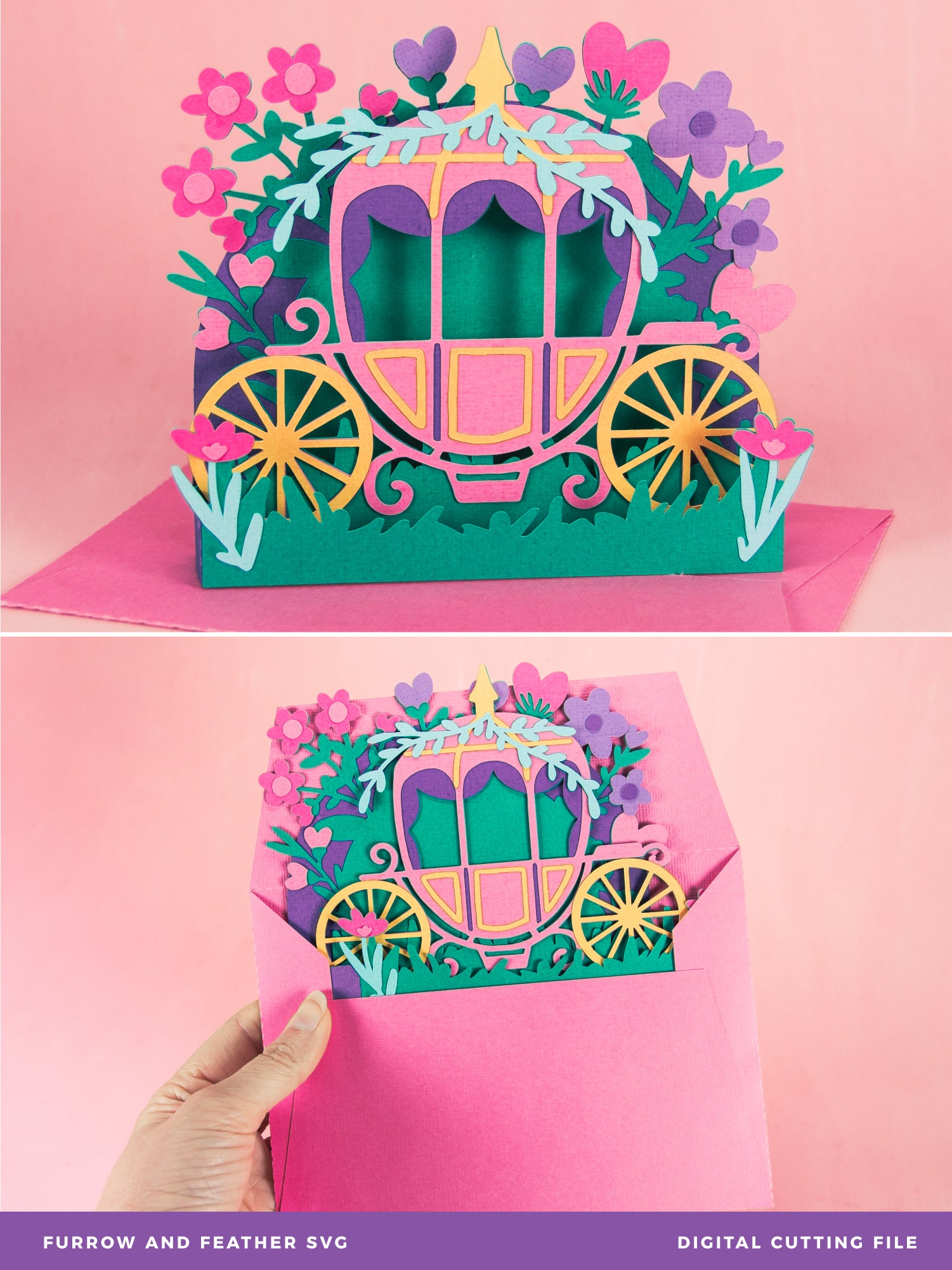 Create the cutest birthday card with this Princess Carriage Card - a 3D any occasion card SVG! This is such a sweet card for your favorite princess - your daughter, granddaughter, niece, sister, or friend! I love this one for a birthday, as a congratulations card, or for any occasion. This design features a princess carriage surrounded by flowers. I love the idea of using gold glitter cardstock for the wheels & details! This cutting file is perfect for Cricut and Silhouette cutting machines. The card folds flat for easy mailing and fits perfectly in the included 5x7” envelope cut file. Explore more of my card designs for even more cute and creative ideas!