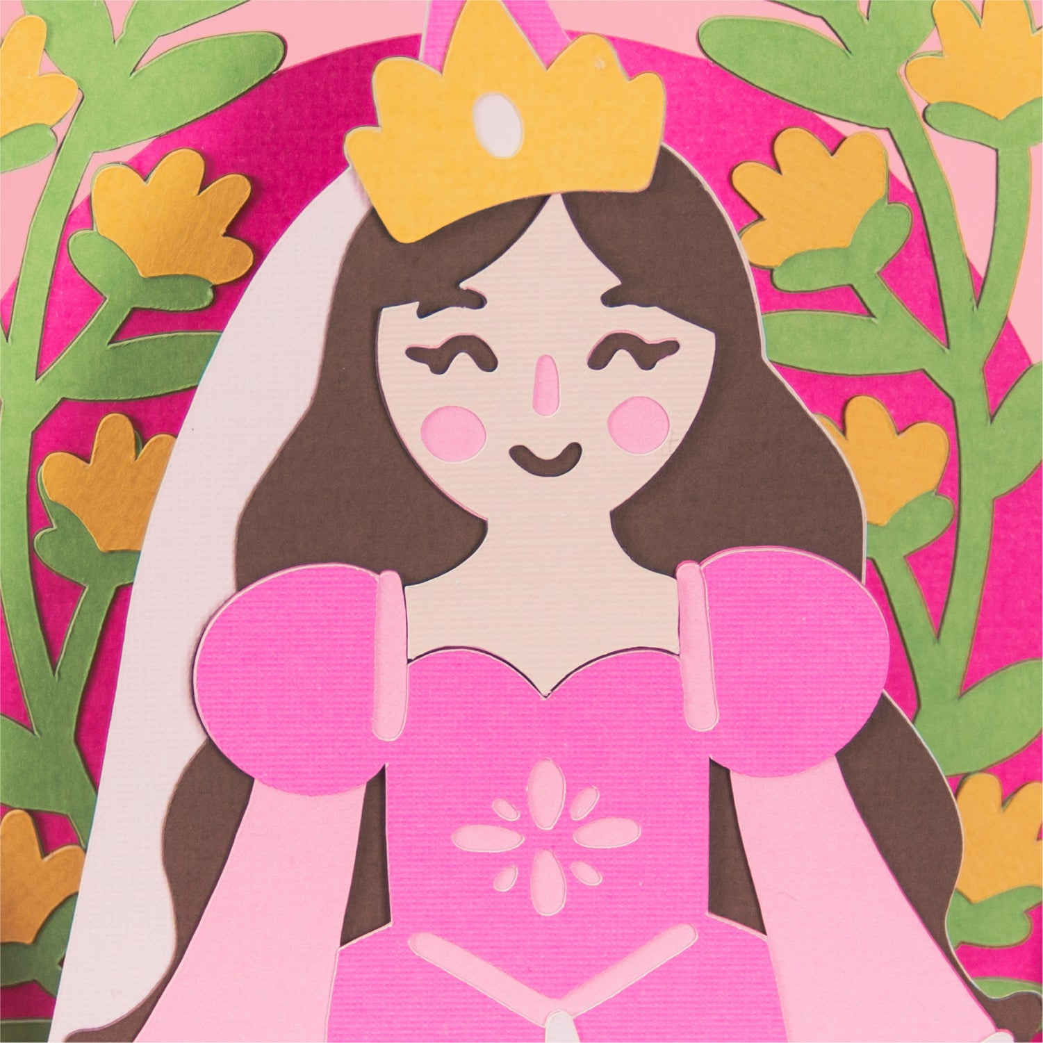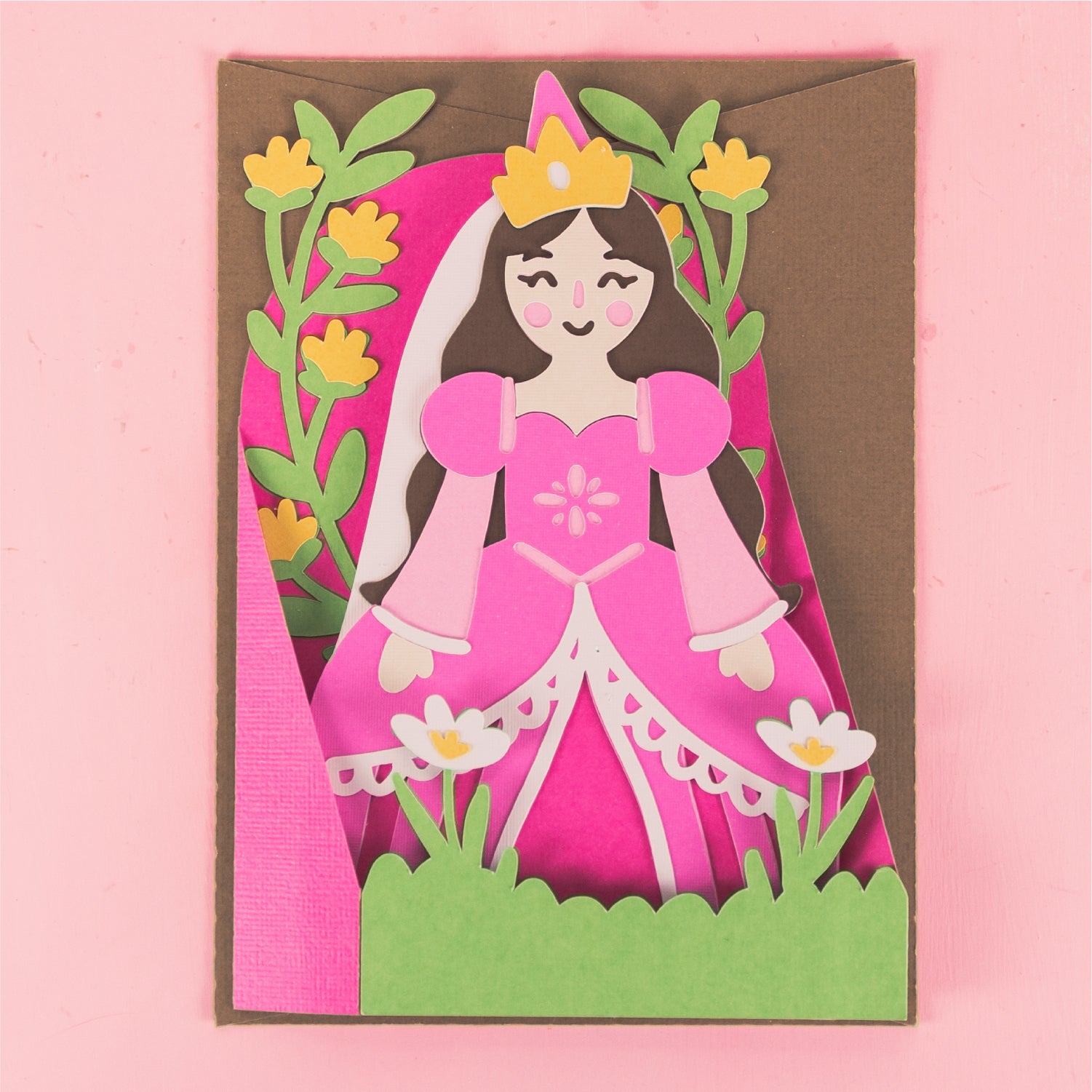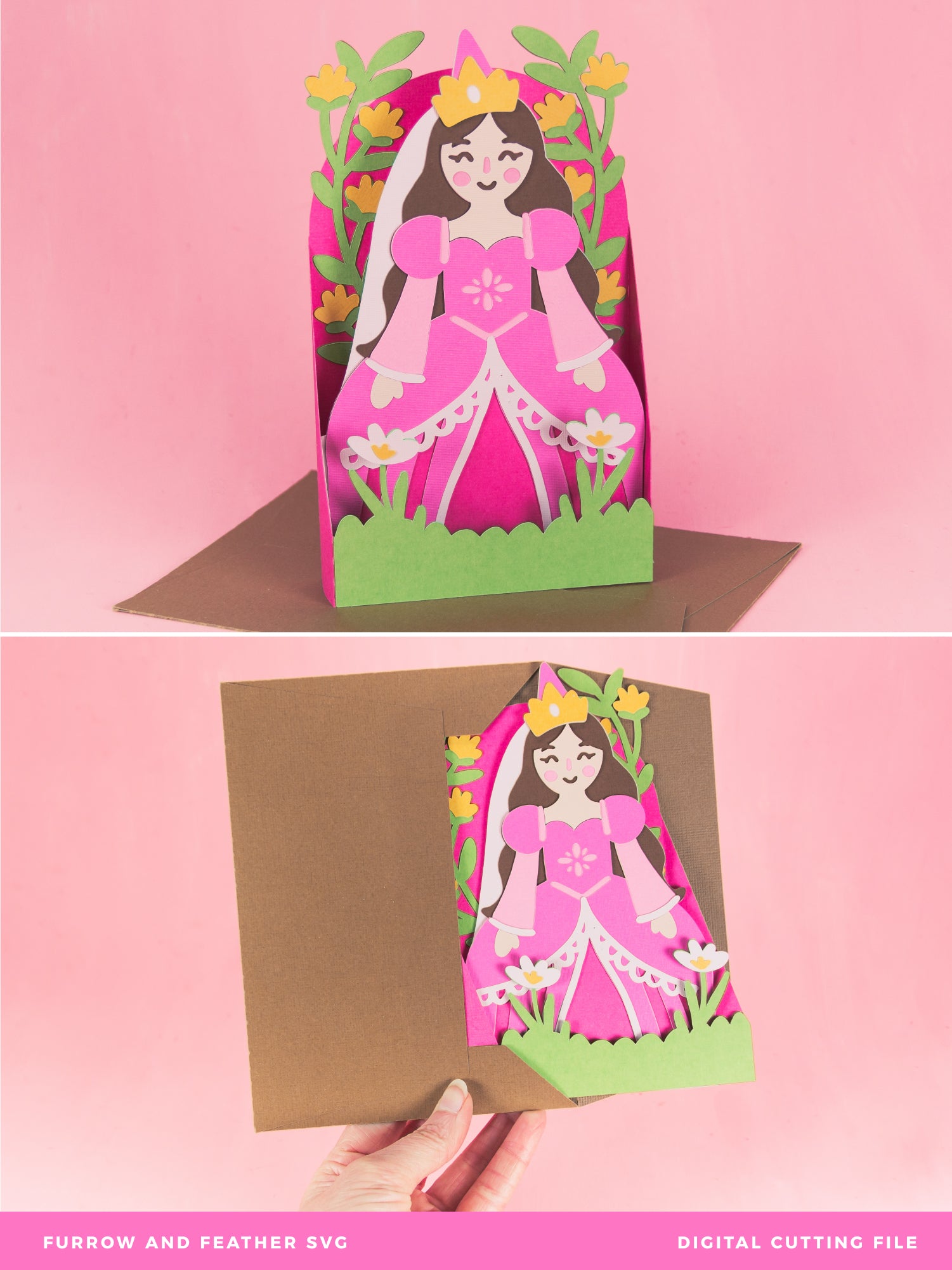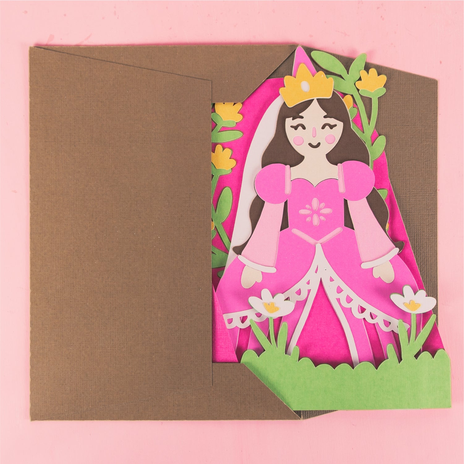 Create the cutest birthday card with this Princess with Flowers Card - a 3D any occasion card SVG! This such a sweet card for your favorite princess - your daughter, granddaughter, niece, sister, or friend! I love this one for a birthday, as a congratulations card, or for any occasion. This design features a princess in a dress, with a princess hat & crown surrounded by flowers. I love updating the hair color and skin tone to match the recipient. I also like to match the dress color to their favorite color! This cutting file is perfect for Cricut and Silhouette cutting machines. The card folds flat for easy mailing and fits perfectly in the included 5x7” envelope cut file. Explore more of my card designs for even more cute and creative ideas!