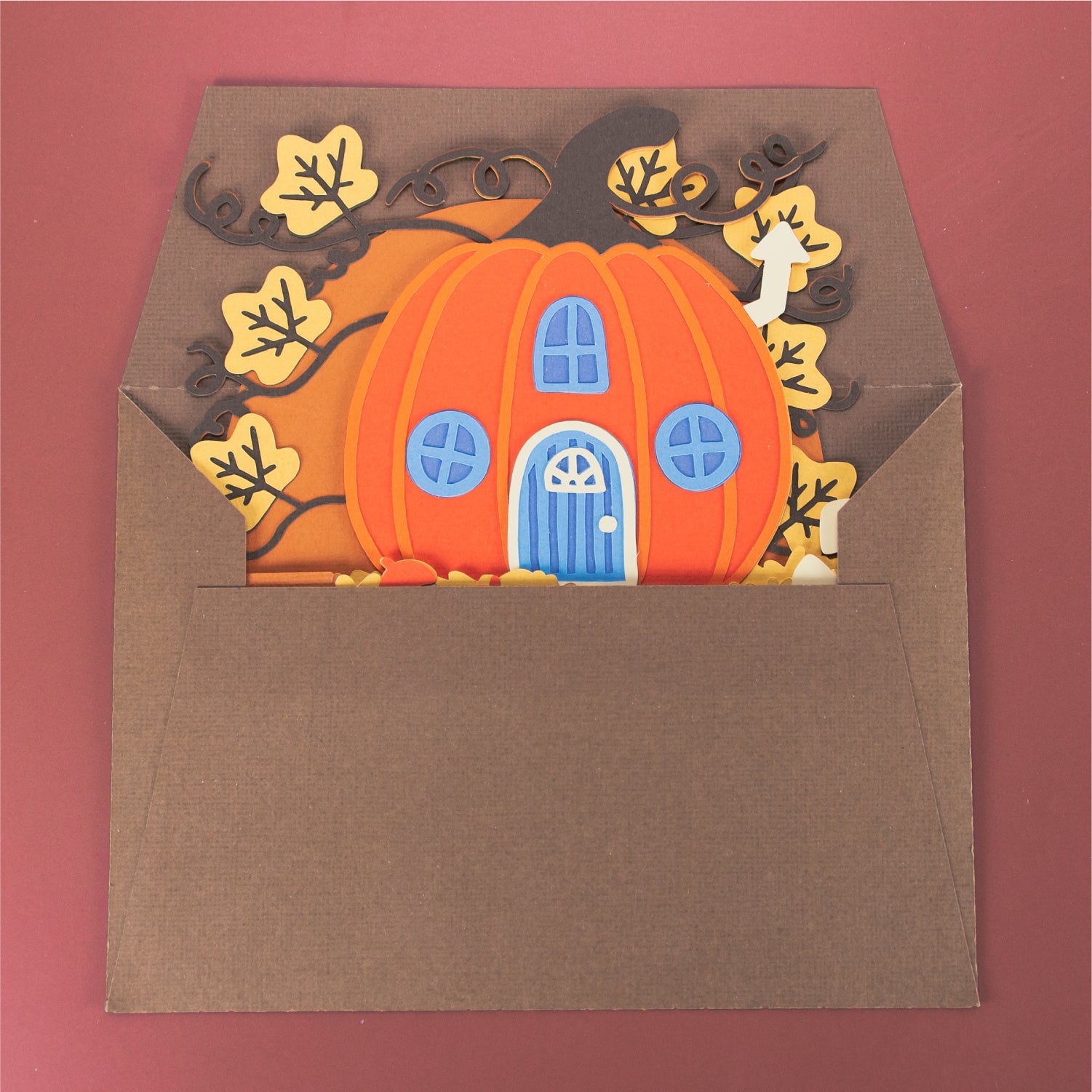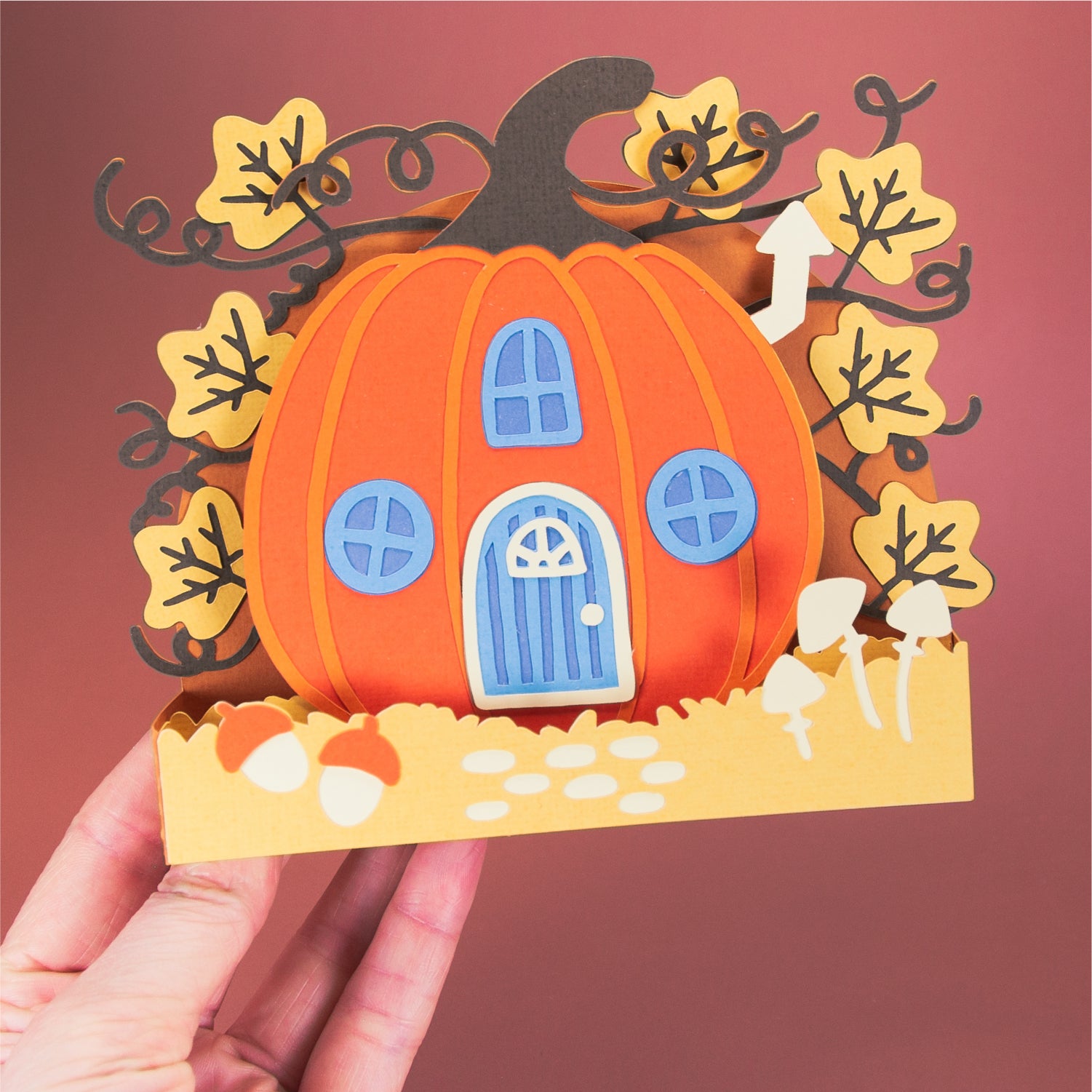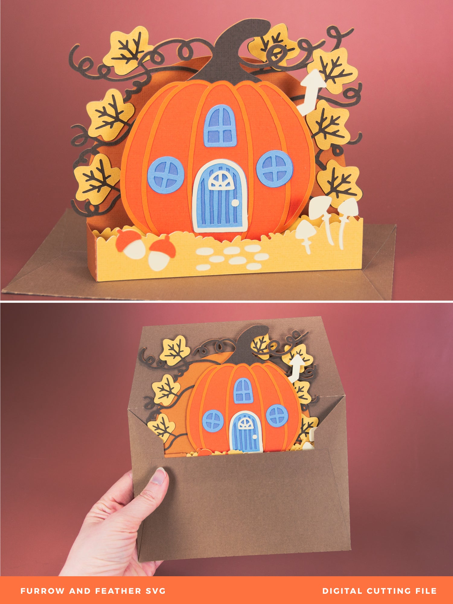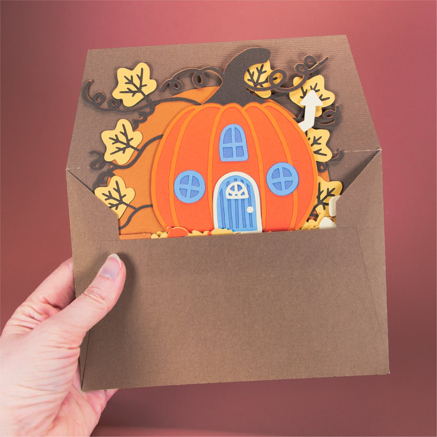 Create the cutest fall card with this Pumpkin House Card - a 3D Autumn Card SVG! Featuring a home made out of a pumpkin, this cutting file is perfect for Cricut and Silhouette cutting machines. The card folds flat for easy mailing and fits perfectly in the included 5x7” envelope cut file. Change the color of the windows and doors for a more customized look (I think purple would look great), and add your own words to the front! Explore more of my designs for even more cute and creative papercraft ideas!