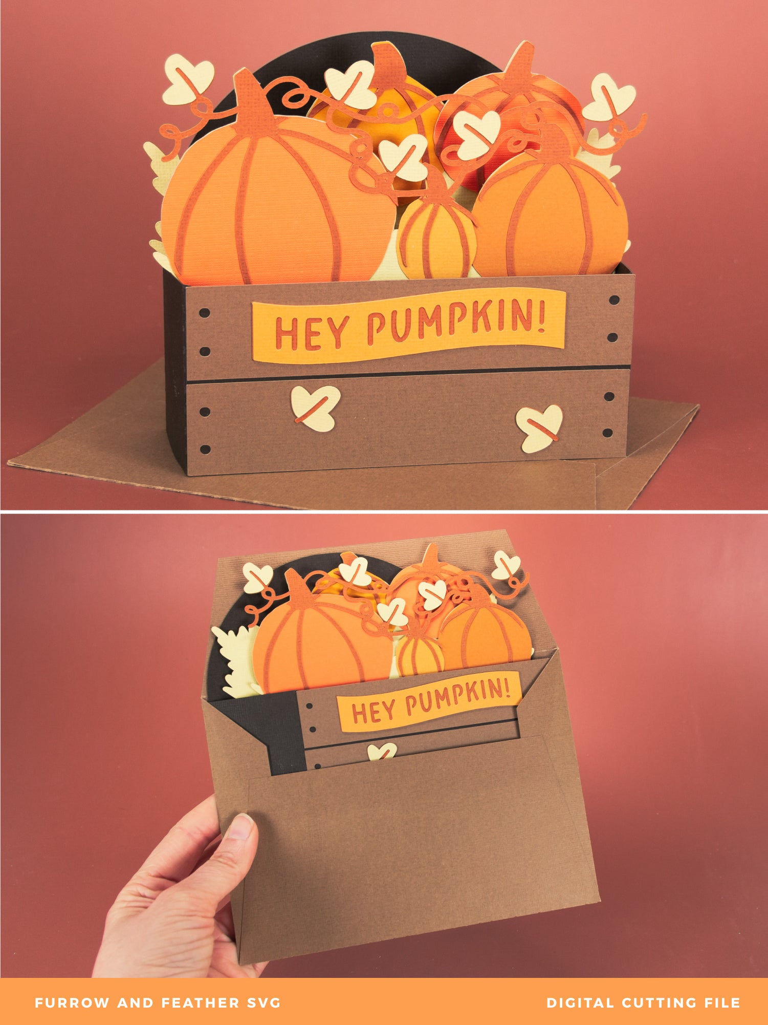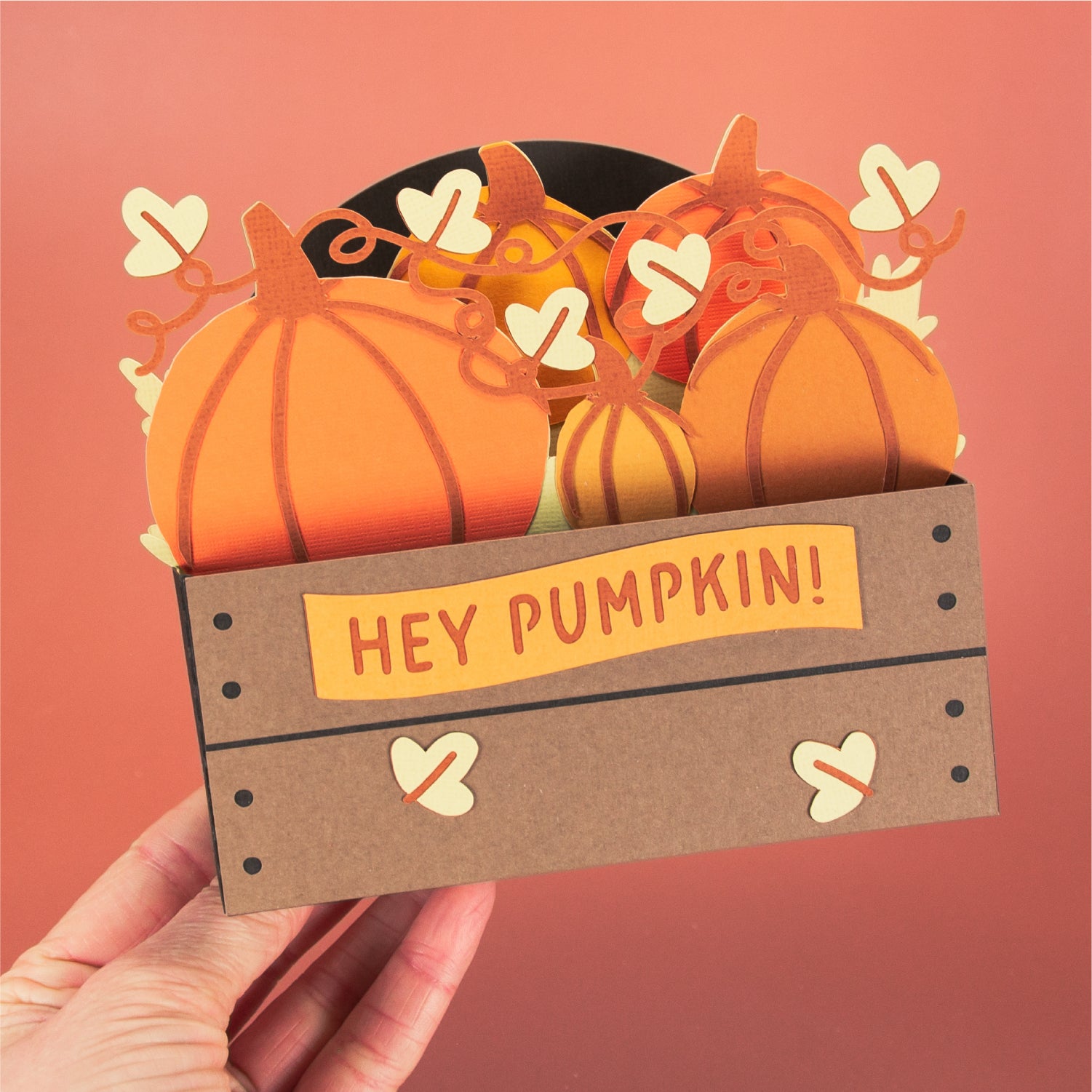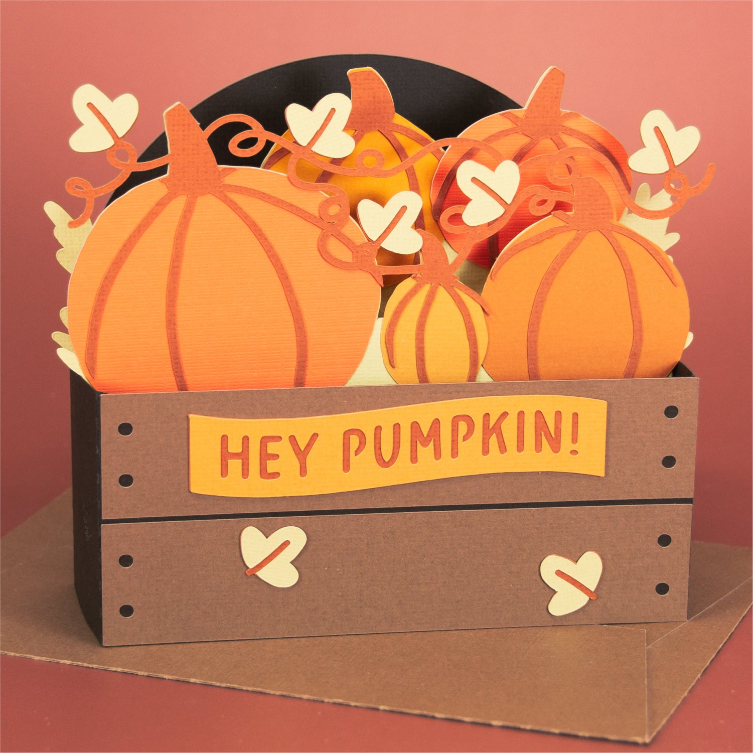 Create a super cute autumn card with this Pumpkins in a Crate card design - a 3D card SVG! It works well for any occasion. This design features a crate full of pumpkins. I love this one for Halloween too. Includes the optional phrase ‘Hey Pumpkin!’, but you can always add your own! This cutting file is perfect for Cricut and Silhouette cutting machines. The card folds flat for easy mailing and fits perfectly in the included 5x7” envelope cut file. Explore more of my card designs for even more cute and creative papercraft ideas!