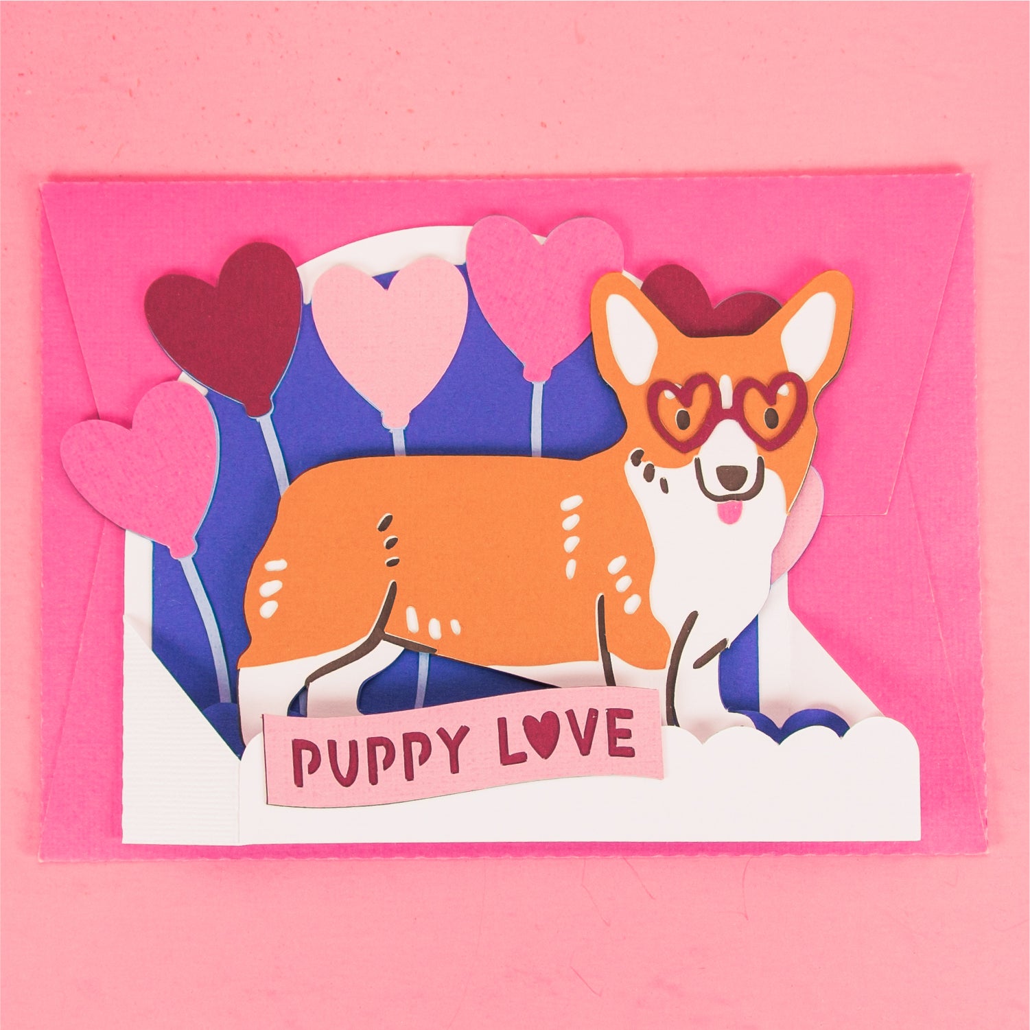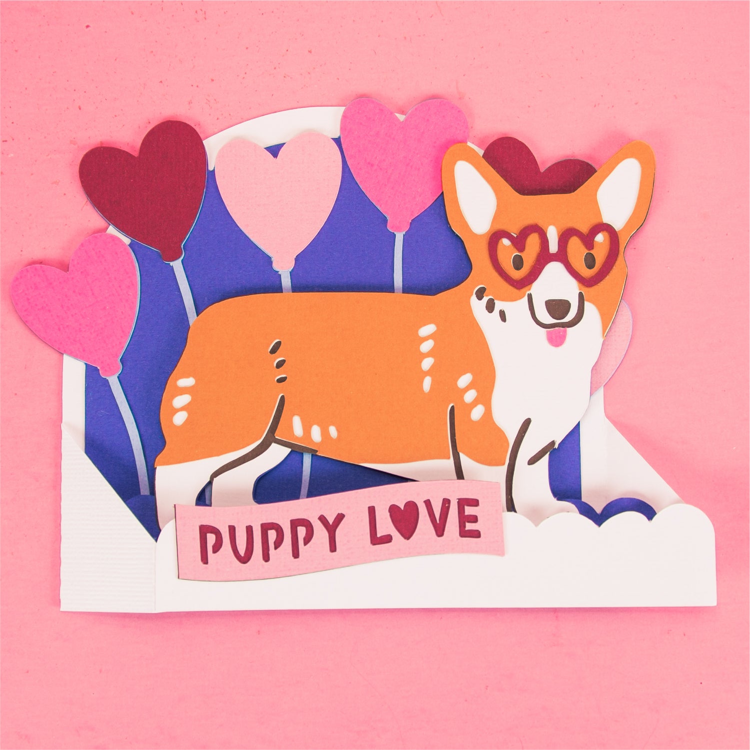 Create an adorable Valentine's Day card with this Puppy Love Corgi Card SVG! This design features a corgi in heart glasses, in front of some colorful heart balloons. I love this one for Valentine's Day, a birthday, or for a new pet! Includes the optional phrase 'Puppy Love'. I'd love to see the balloons in a patterned or glitter cardstock! This cutting file is perfect for Cricut and Silhouette cutting machines. This design folds flat for easy mailing and fits perfectly in the included 5x7” envelope cut file. Explore more of my card designs for even more cute and creative papercraft ideas!