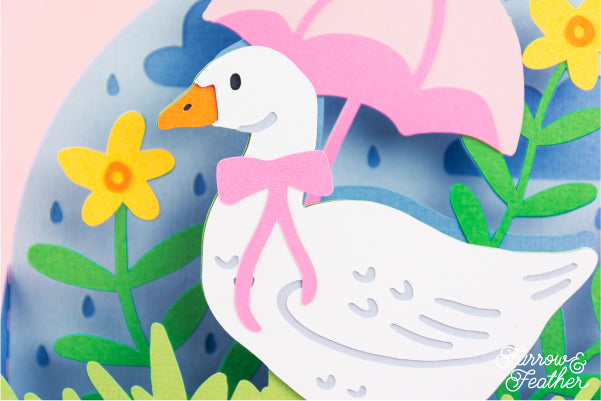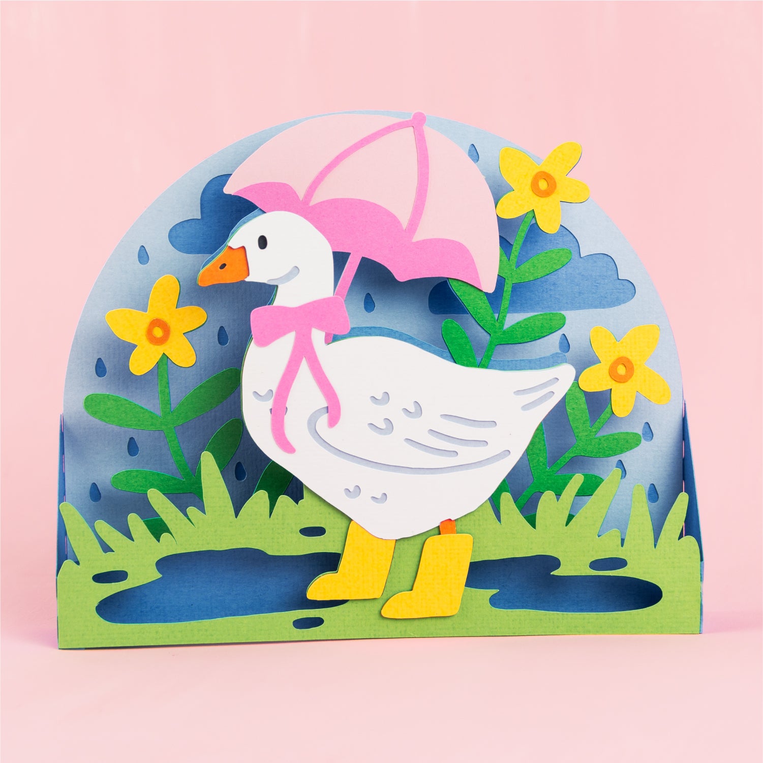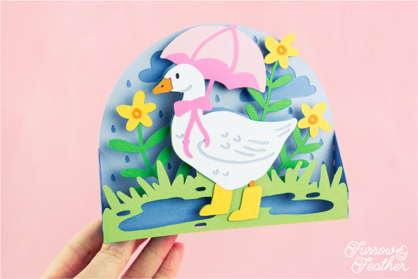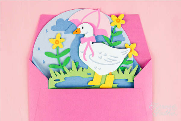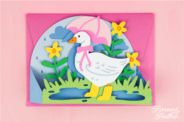 Such a fun card for Easter or for Spring! A great reminder for a loved one that sunny days are ahead! Change the color of the bow, rainboots & umbrella to really customize the card. Includes a white piece for the back so you can write a note. Folds flat to fit in the included 5x7” envelope cut file.