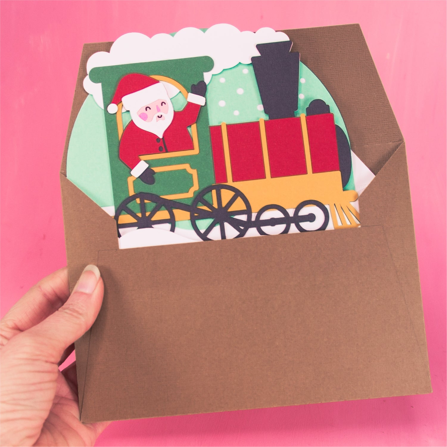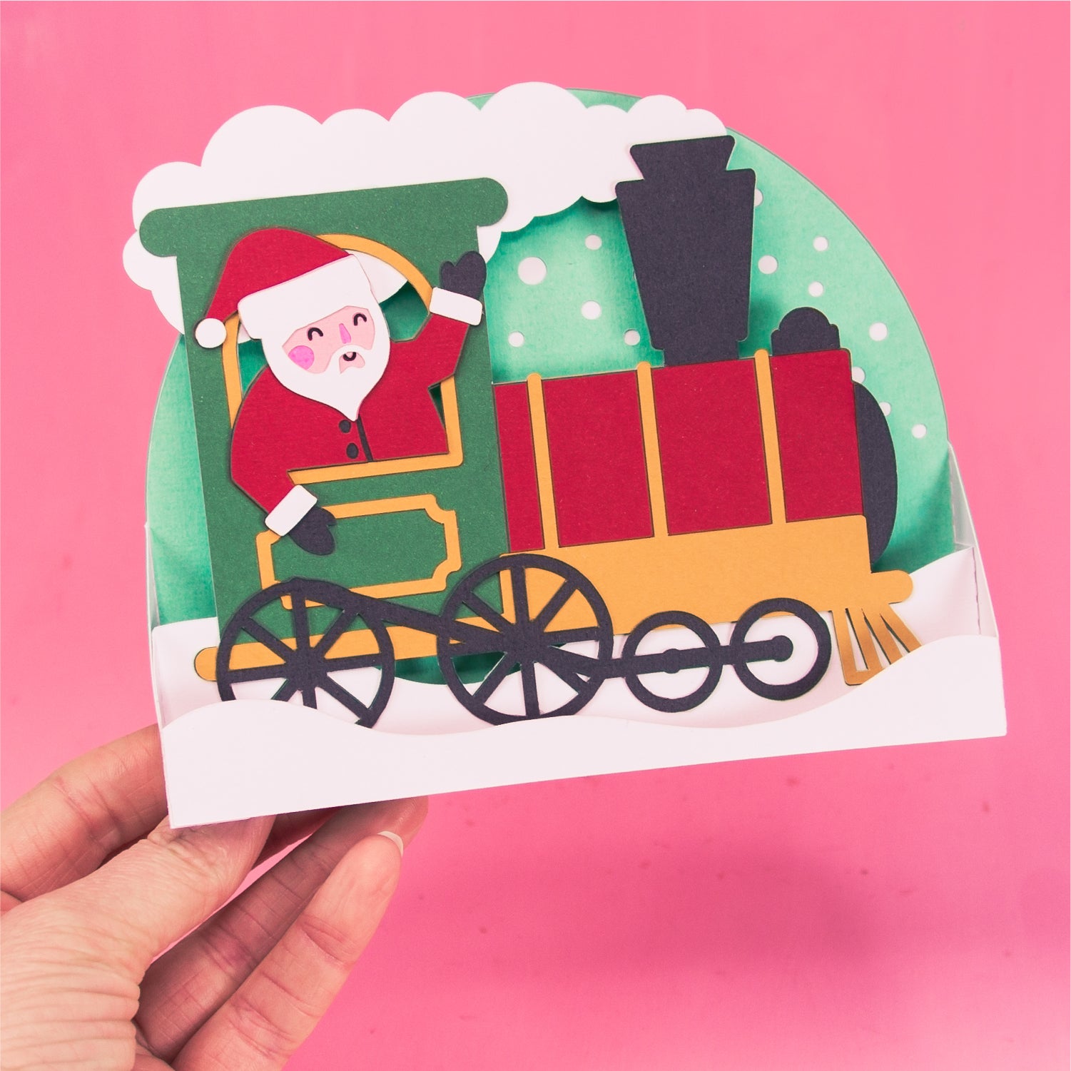 Create a super fun card for Christmas with this Santa Christmas Train card design - a 3D Christmas card SVG! This design features Santa Claus in a festive train. He's leaning out of the train window & waving! I'd love to see some of the train details in gold foil cardstock! This cutting file is perfect for Cricut and Silhouette cutting machines. The card folds flat for easy mailing and fits perfectly in the included 5x7” envelope cut file. Explore more of my card designs for even more cute and creative Christmas papercraft ideas!