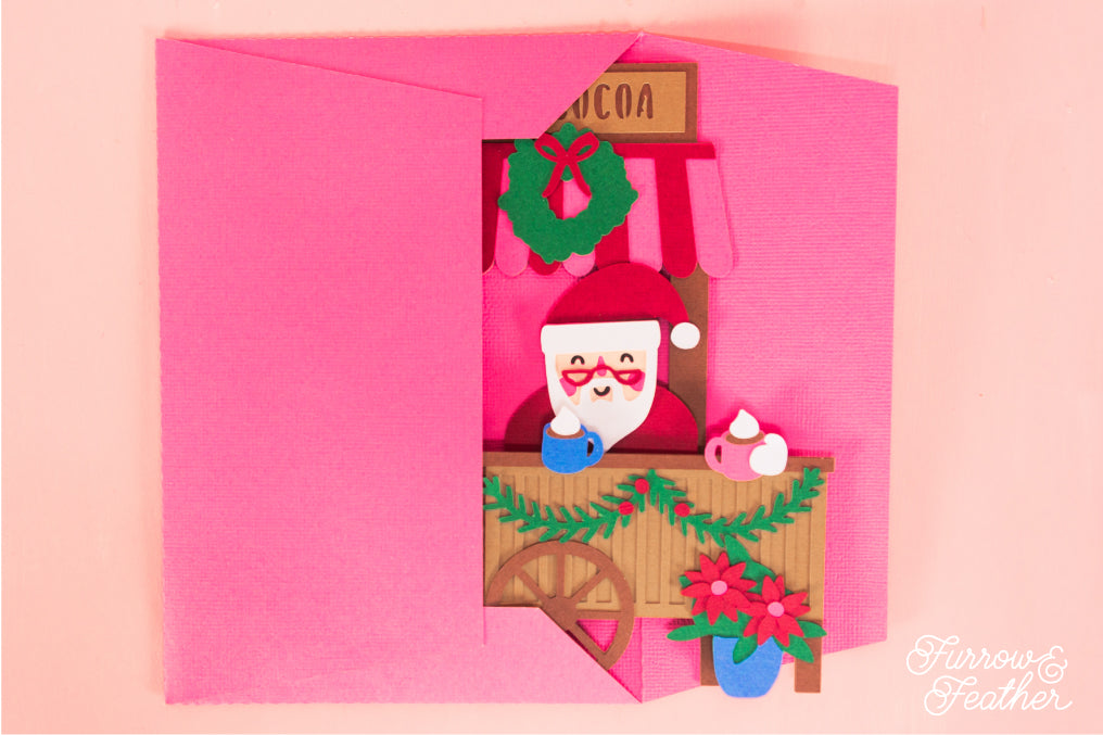 Add some joy to your holiday crafting with this delightful Santa Hot Cocoa Stand Christmas Card SVG file! Featuring a charming design of Santa serving warm hot chocolate, this festive card is perfect for Cricut and Silhouette cutting machines. The card folds flat for easy mailing and fits neatly into the included 5x7” envelope cut file. Be sure to explore my full collection of holiday designs for even more fun Christmas card SVG files!