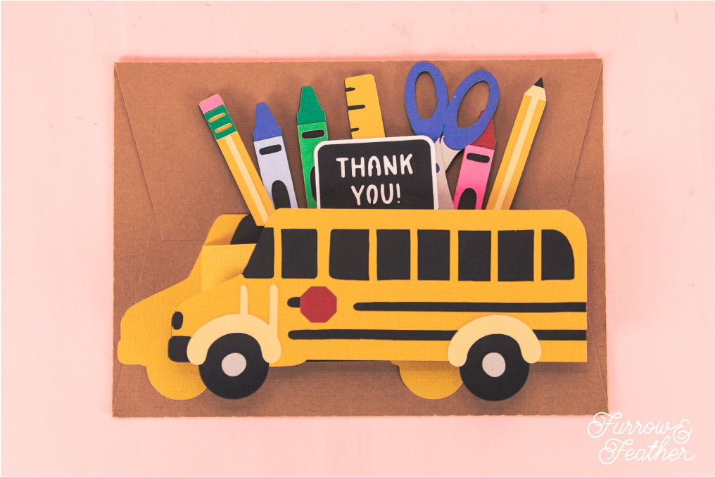 Create a fun Teacher Appreciation card or Teacher gift with this School Bus Card SVG file! Features the phrase 'Thank You', and colorful school supplies. This cutting file is perfect for Cricut and Silhouette cutting machines. The card folds flat for easy mailing and fits perfectly in the included 5x7” envelope cut file. Explore more of my school-themed card designs for even more cute and creative ideas!