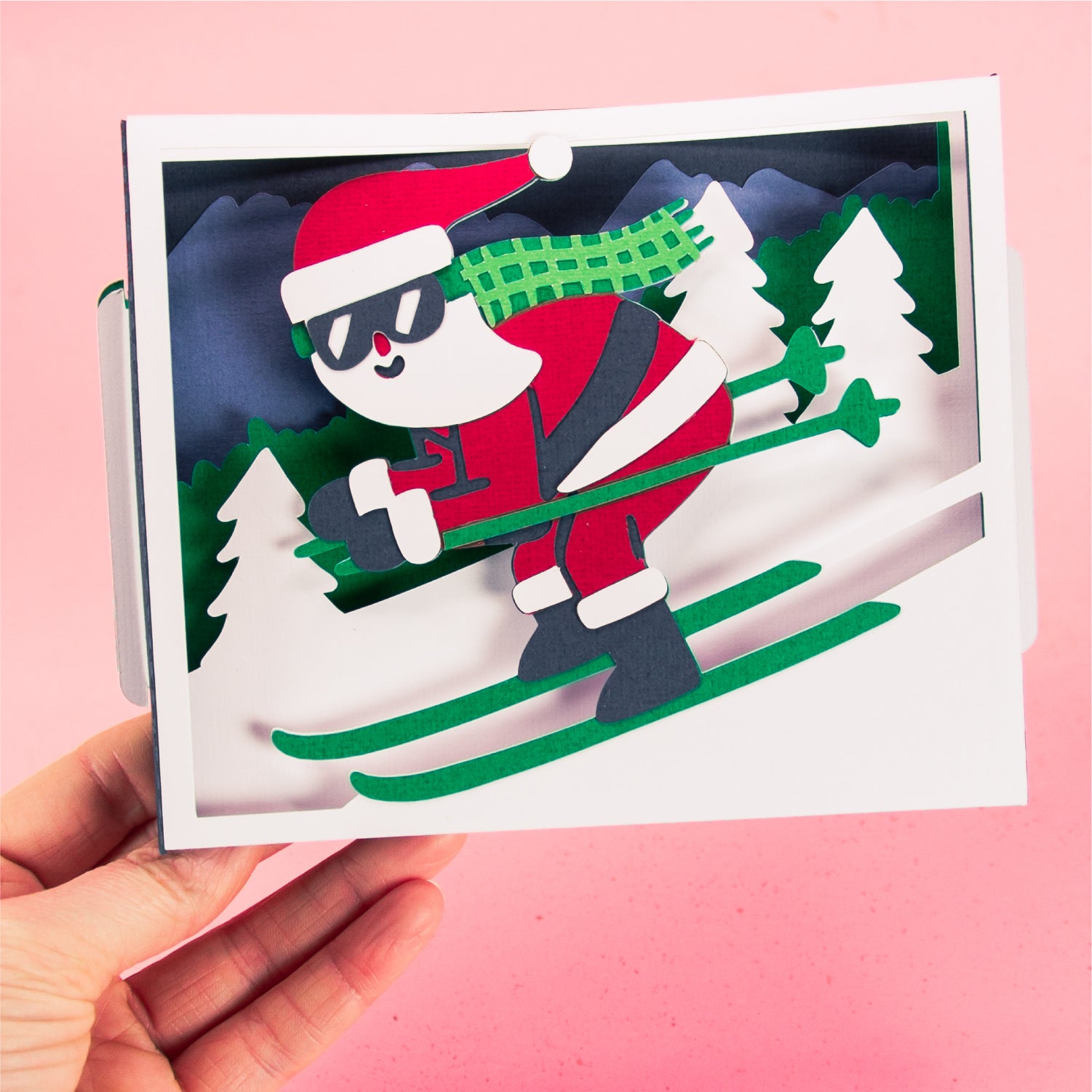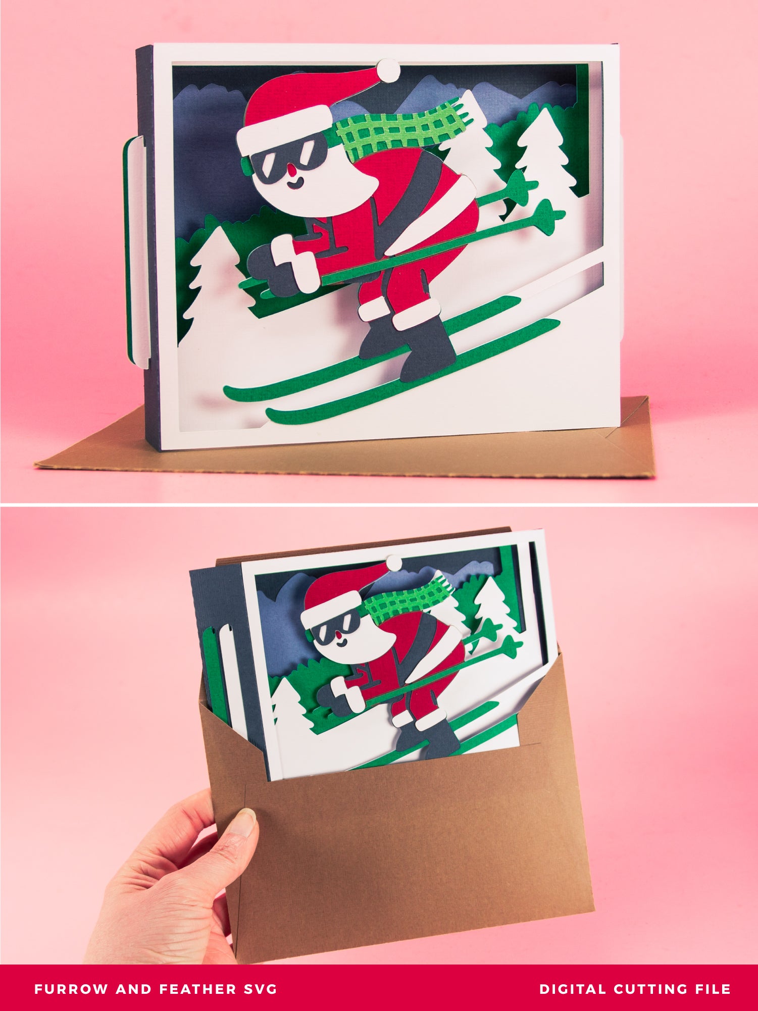 Create a super fun card for Christmas with this Skiing Santa card design - a 3D Christmas card SVG! This is a layered design, featuring Santa Claus skiing down a mountain! There are trees and mountains in the background. I love updating the cardstock colors the skis & scarf! This cutting file is perfect for Cricut and Silhouette cutting machines. The card folds flat for easy mailing and fits perfectly in the included 5x7” envelope cut file. Explore more of my card designs for even more cute and creative Christmas papercraft ideas!