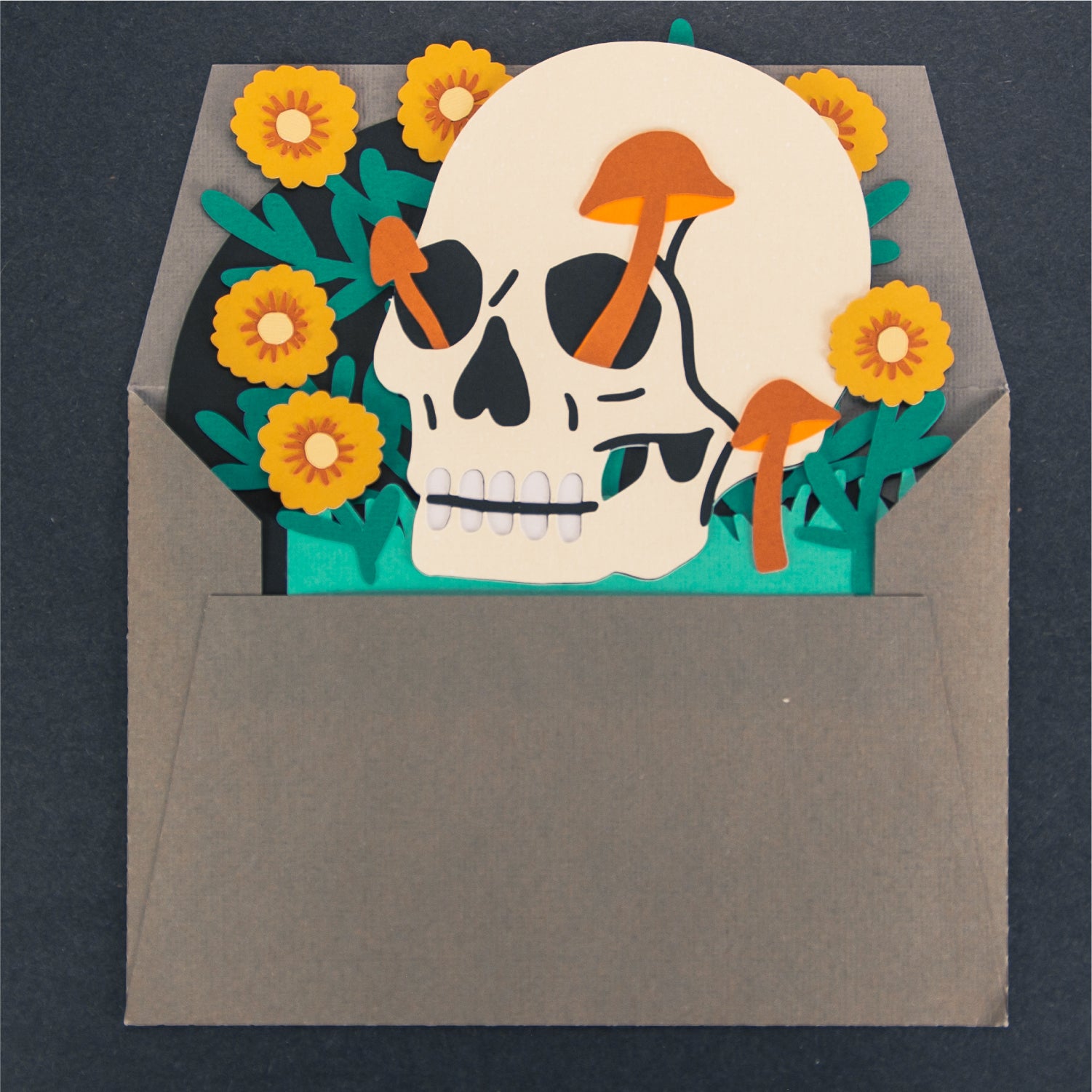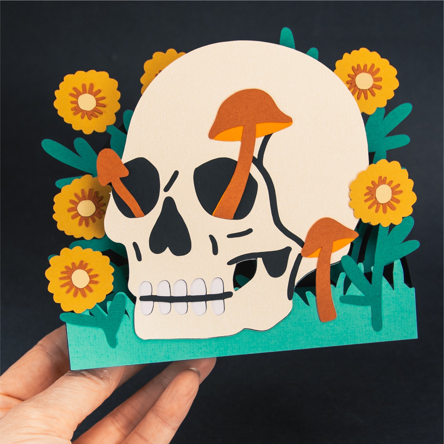 Create a spooky Halloween card with this Skull with Flowers card design - a 3D Halloween SVG! This design features a skull with mushrooms growing out of it, sitting in front of some flowers. I love updating the cardstock colors for the mushrooms and flowers! I think purple looks great. This cutting file is perfect for Cricut and Silhouette cutting machines. The card folds flat for easy mailing and fits perfectly in the included 5x7” envelope cut file. Explore more of my card designs for even more cute and creative Halloween papercraft ideas!