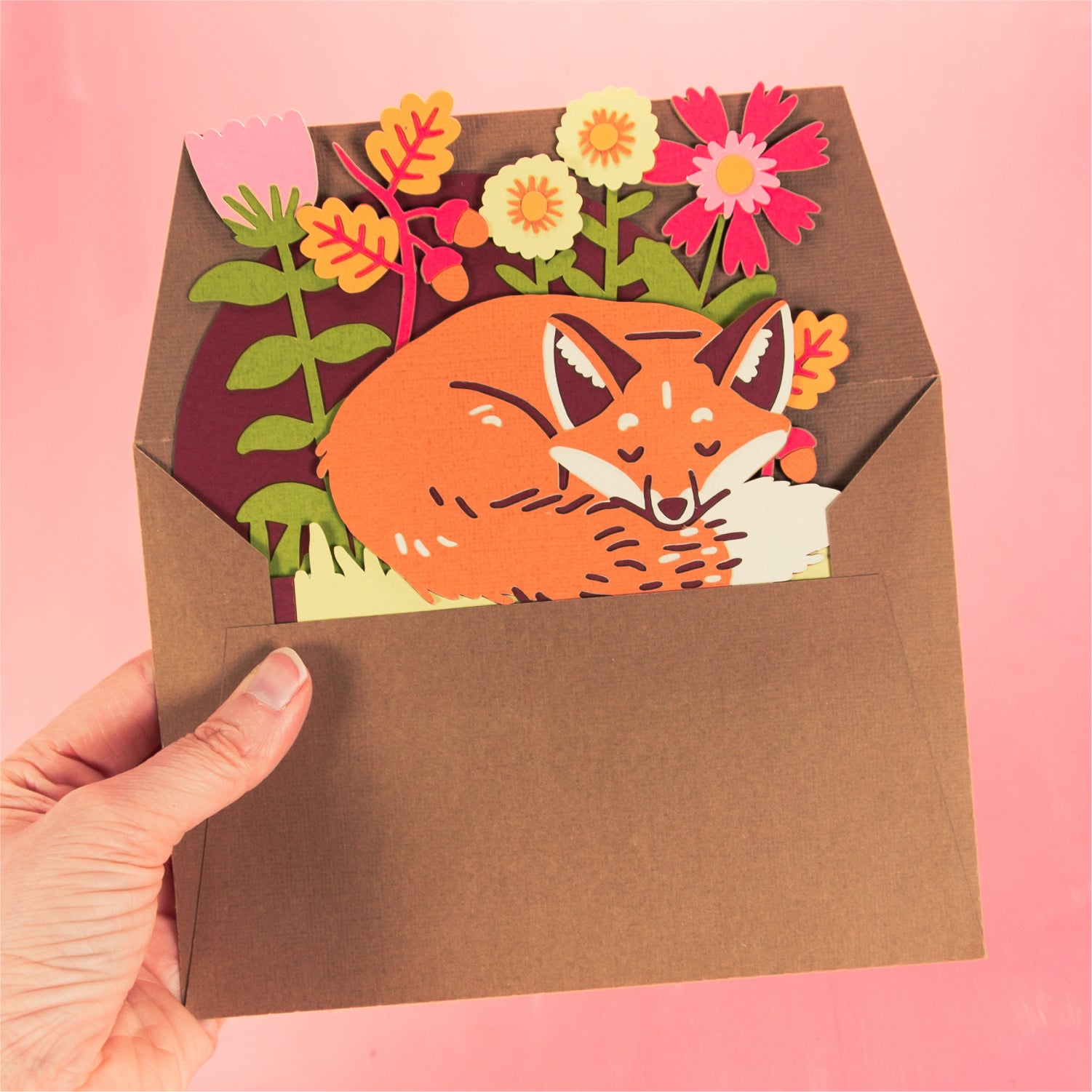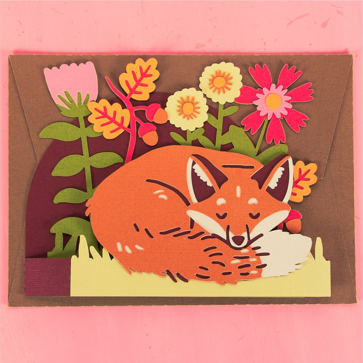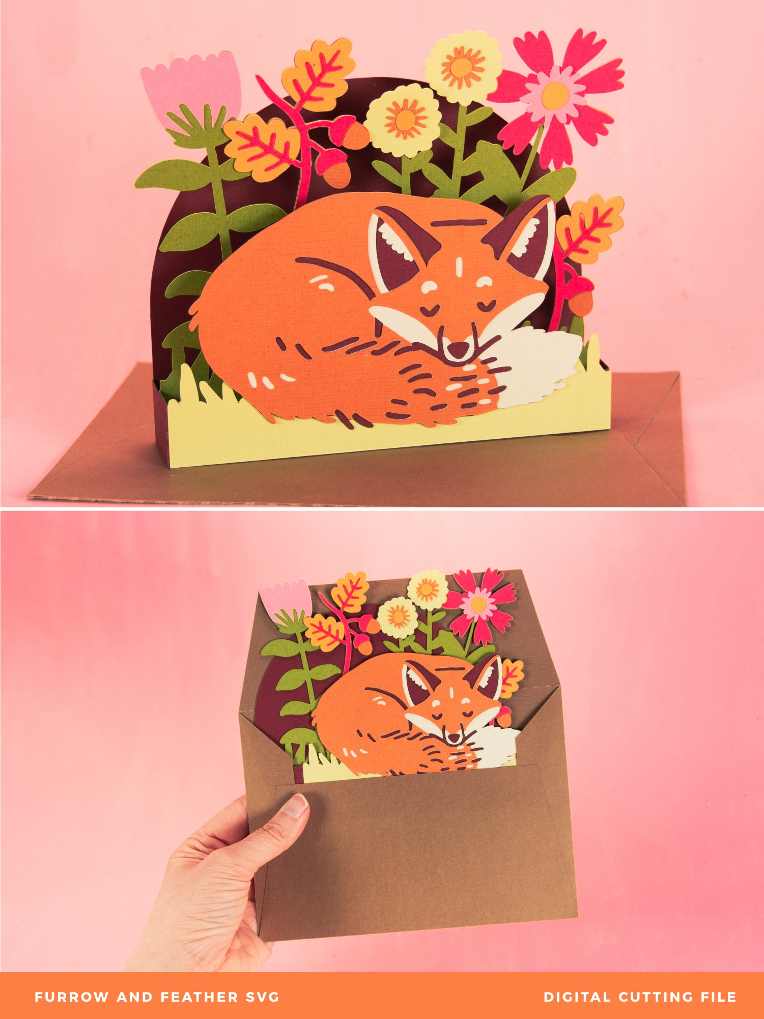 Create the cutest fall card with this Sleeping Fox Card - a 3D Autumn Card SVG! Featuring an adorable fox and some colorful flowers, this cutting file is perfect for Cricut and Silhouette cutting machines. The card folds flat for easy mailing and fits perfectly in the included 5x7” envelope cut file. This design would work great for a birthday, a thank you card, or just because! Change the color of the flowers for a more customized look, and add your own words to the front! Explore more of my designs for even more cute and creative papercraft ideas!