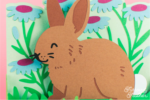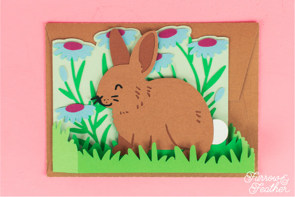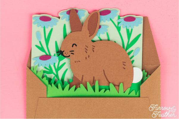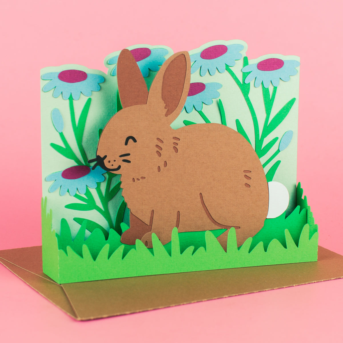 A super cute card for spring or Easter! Would look so sweet with a white bunny too! Change the colors of the flowers to your favorites. Folds flat to fit in the included 5x7” envelope cut file.