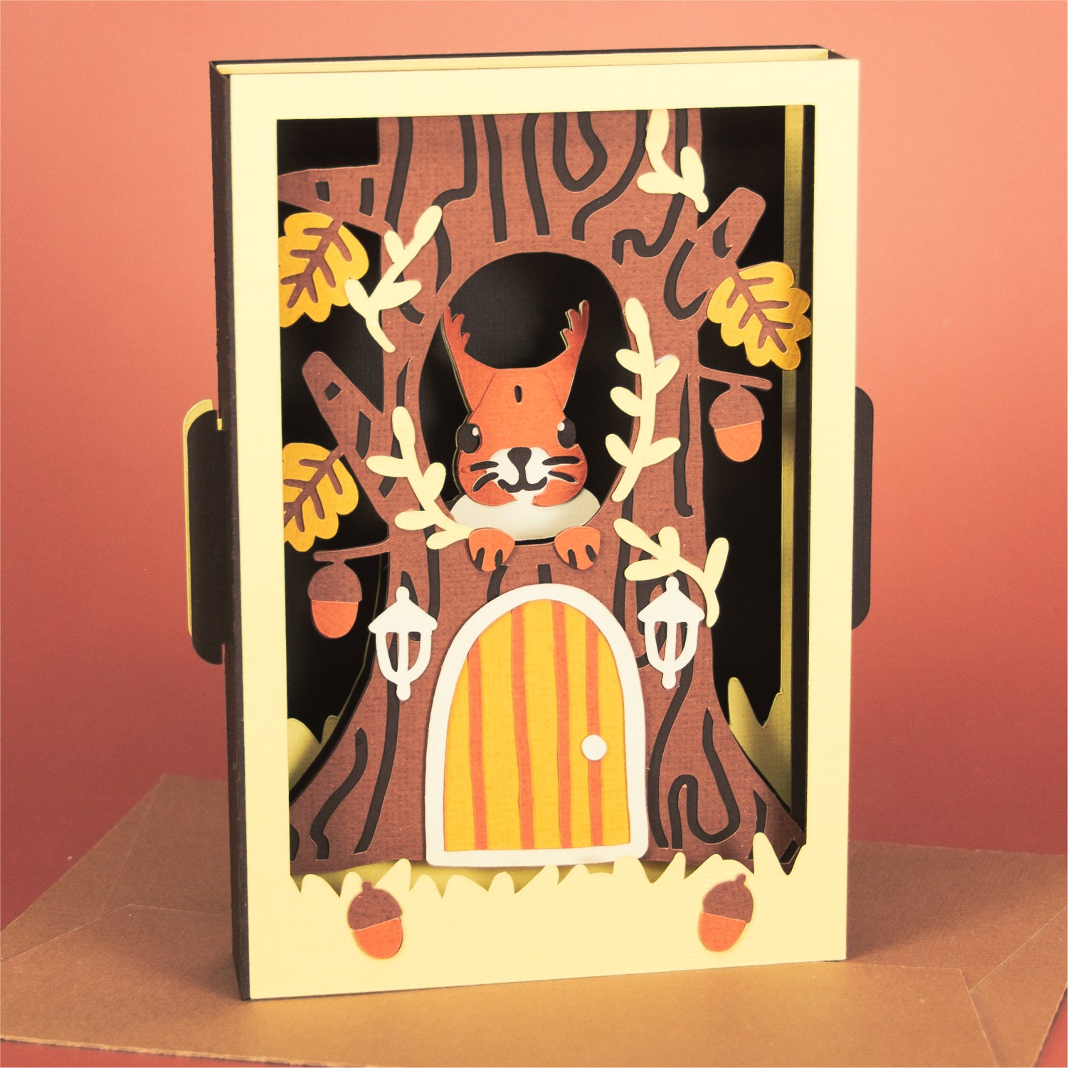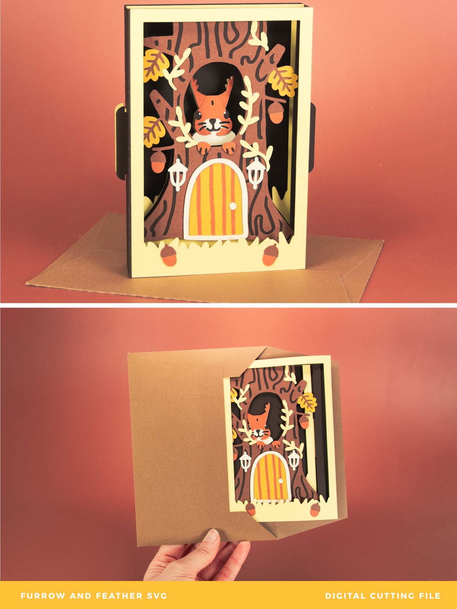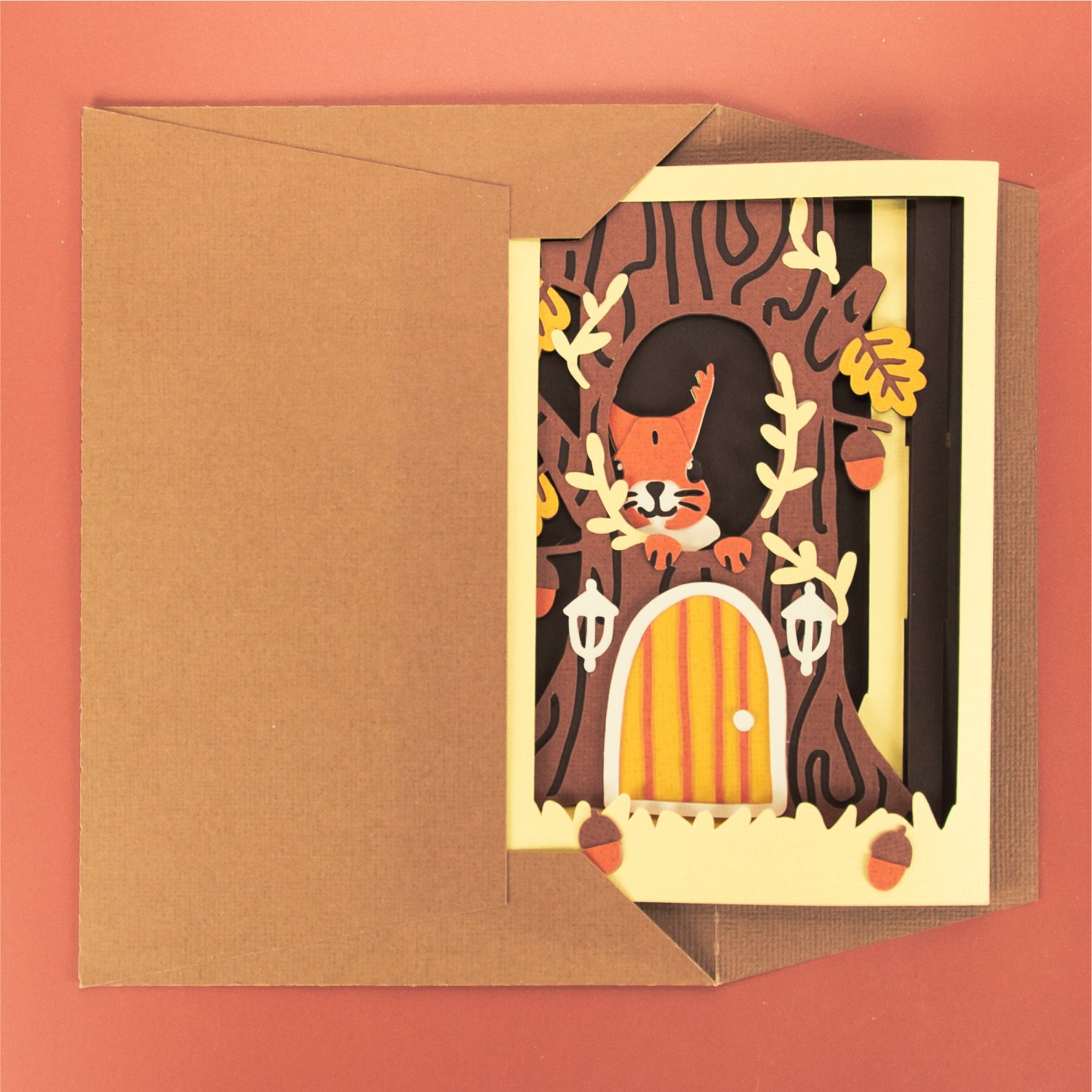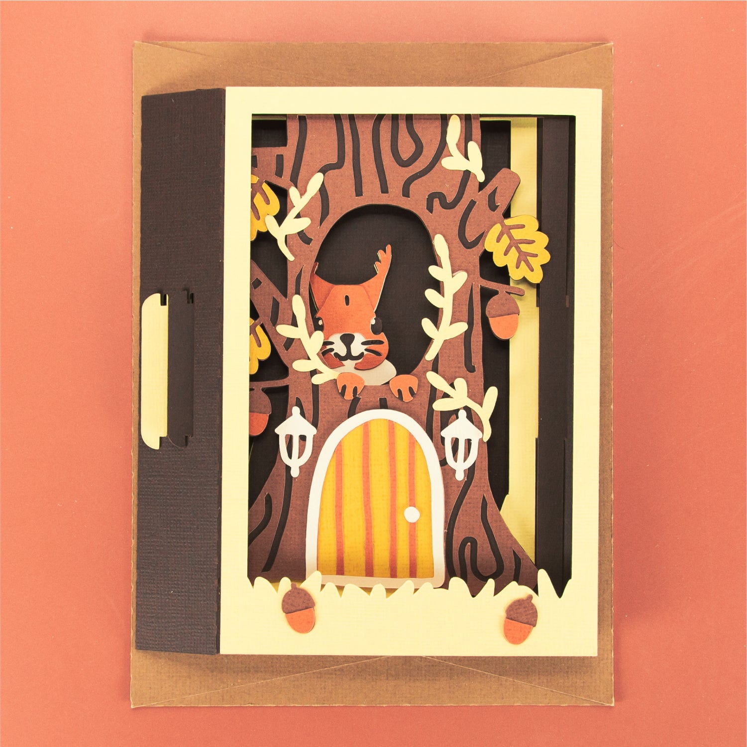 Create the cutest fall card with this Squirrel in a Tree House Card - a 3D Autumn Card SVG! Featuring an adorable squirrel in a tree, this cutting file is perfect for Cricut and Silhouette cutting machines. The card folds flat for easy mailing and fits perfectly in the included 5x7” envelope cut file. This design would work great for a birthday, a thank you card, or just because! Change the color of the door & lights for a more customized look, and add your own words to the front! Explore more of my designs for even more cute and creative papercraft ideas!