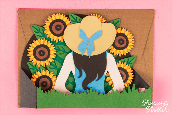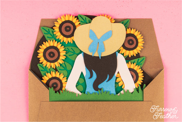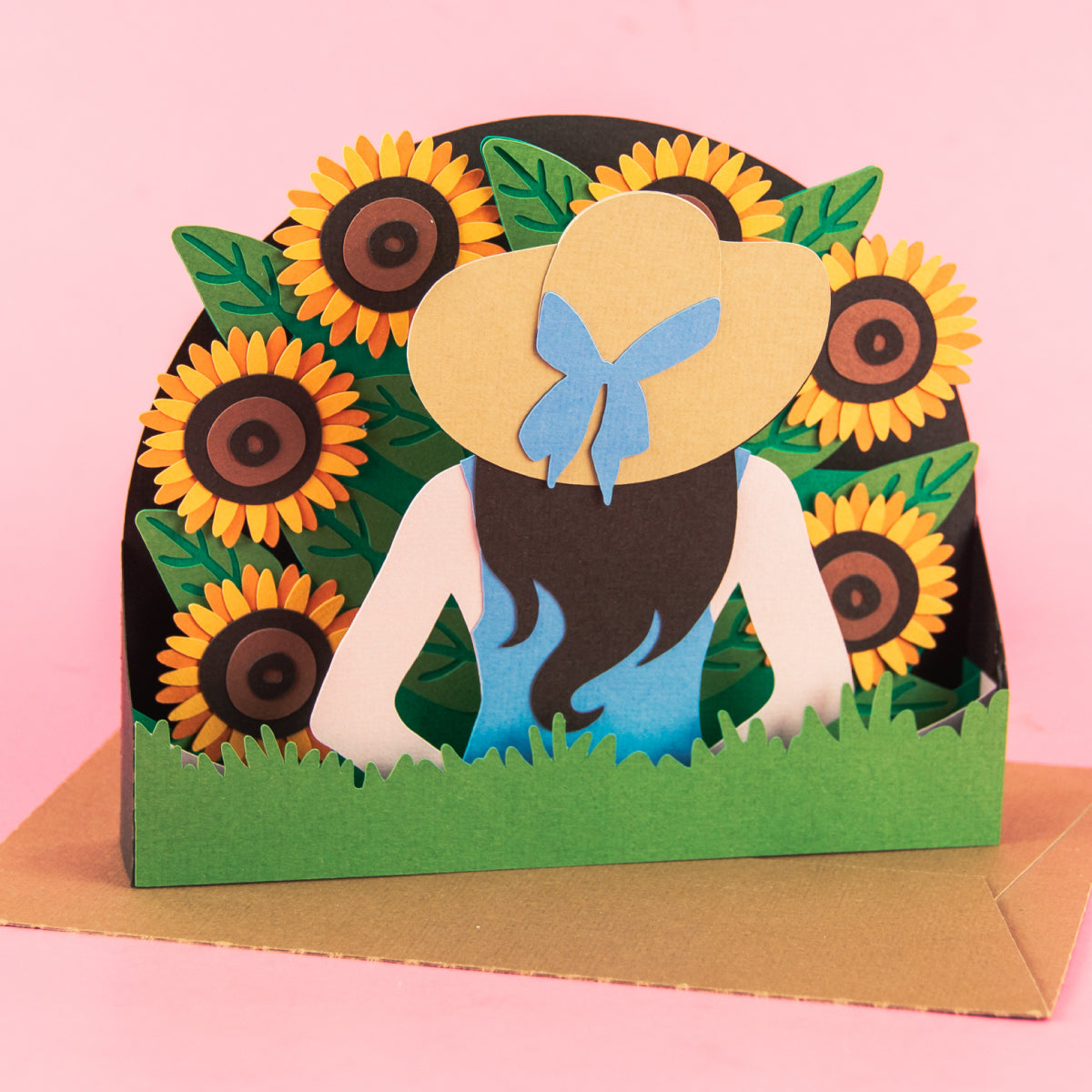 Such a great card for summer or autumn! Change the hair color, or the color of the bow and dress to really customize the card. Add your own sentiment! This card is great for any occasion. Folds flat to fit in the included 5x7” envelope cut file.
