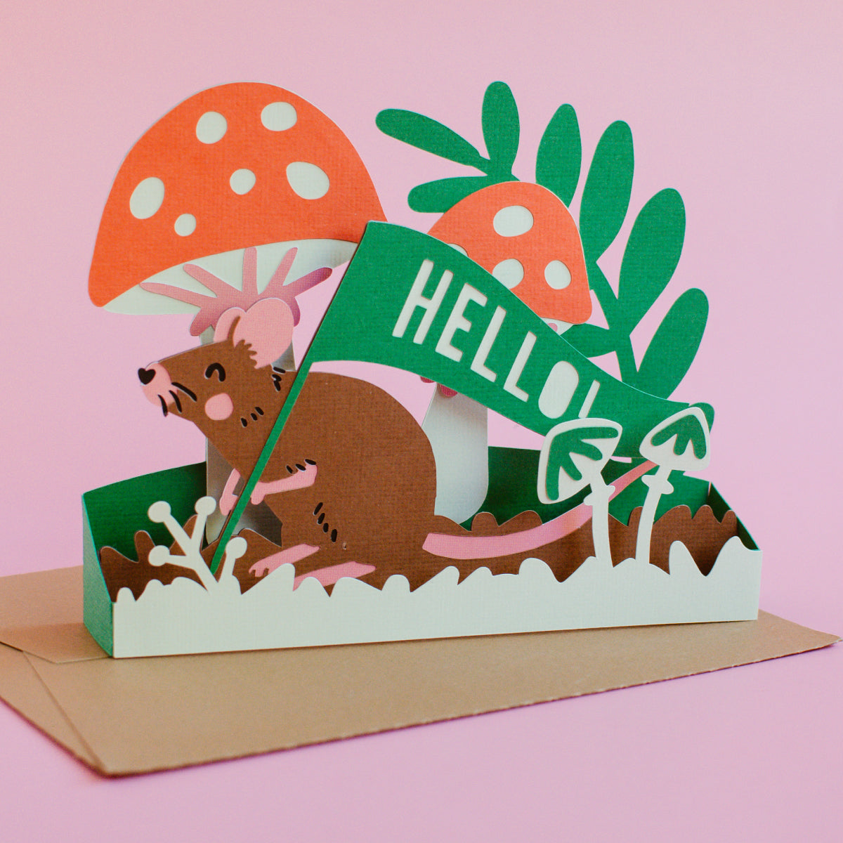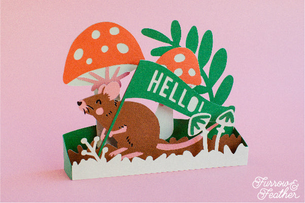 This super cute mushroom mouse card includes nine different banner sentiments to personalize the card for different occasions. Folds flat to fit in the included 5x7” envelope cut file.