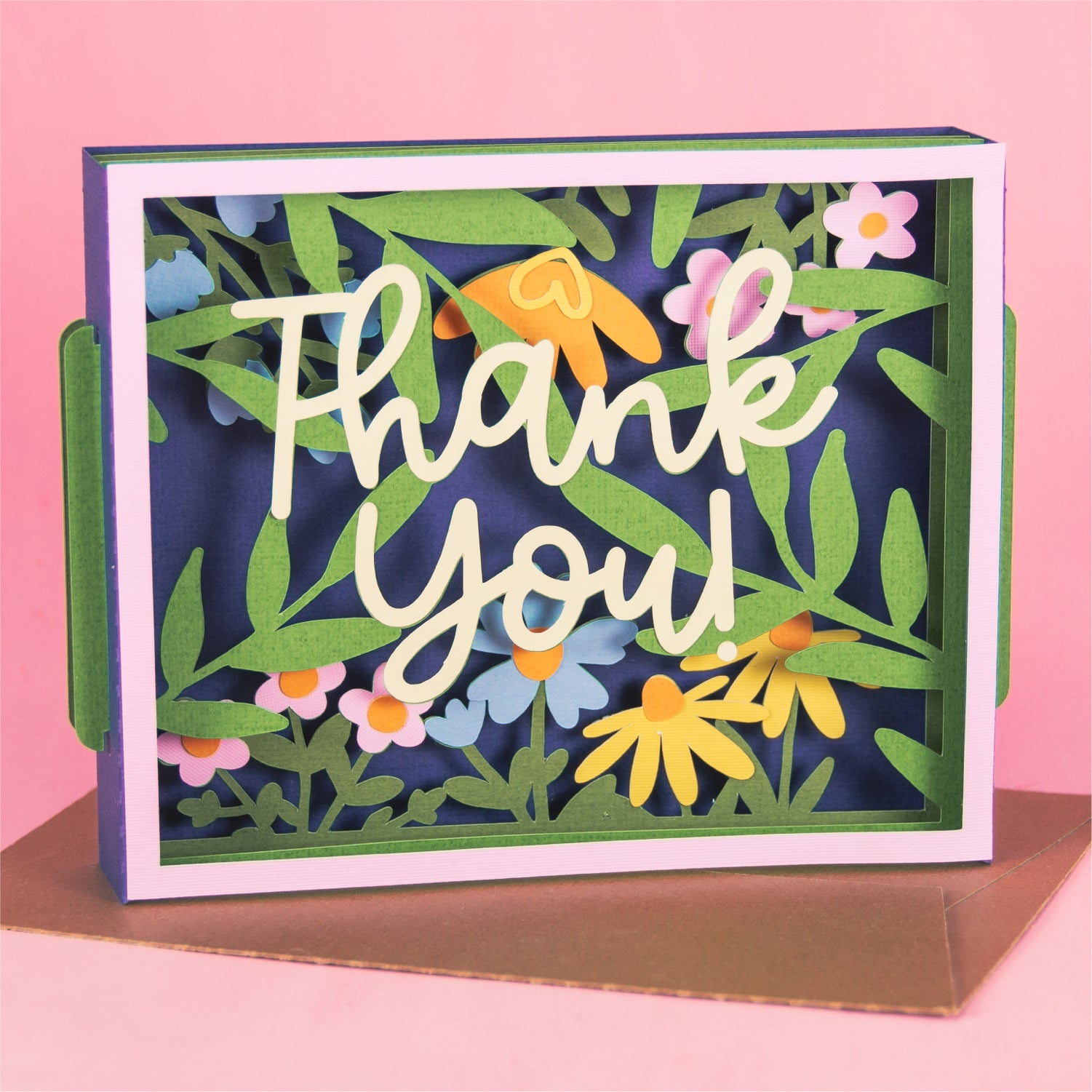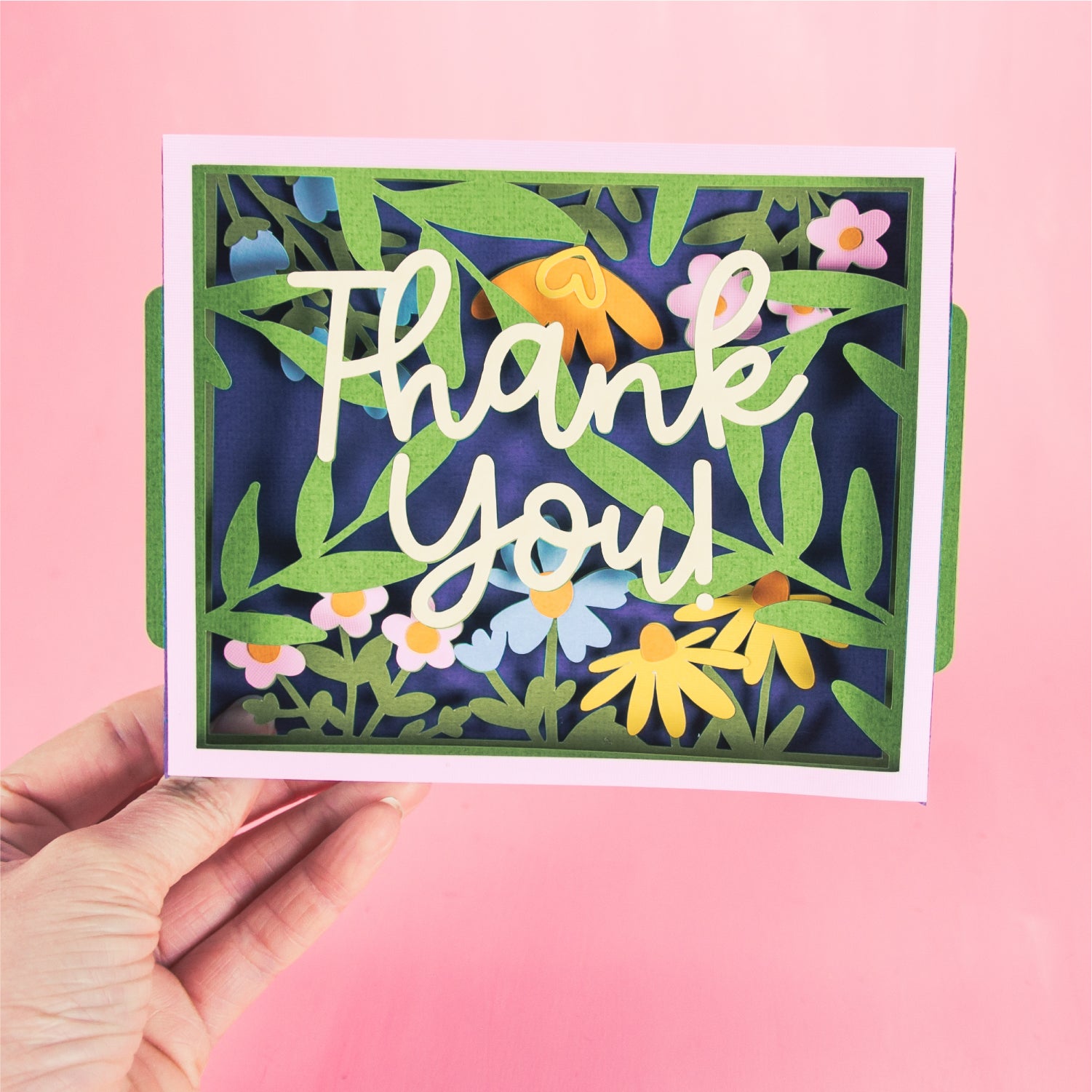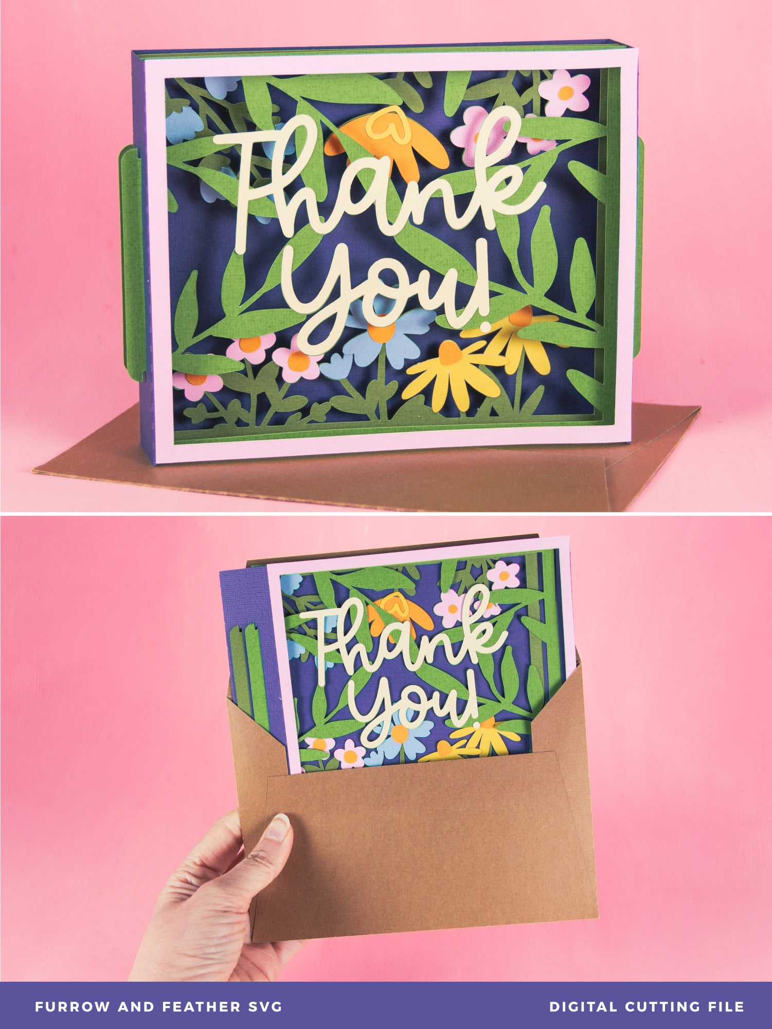 Create a stunning Thank You card with this Thank You Card Layered with Flowers - a 3D card SVG! This is a gorgeous card for a friend, a co-worker, a neighbor, and more! I love updating the cardstock colors to match the recipients favorite flowers! This cutting file is perfect for Cricut and Silhouette cutting machines. The card folds flat for easy mailing and fits perfectly in the included 5x7” envelope cut file. Explore more of my card designs for even more cute and creative ideas!