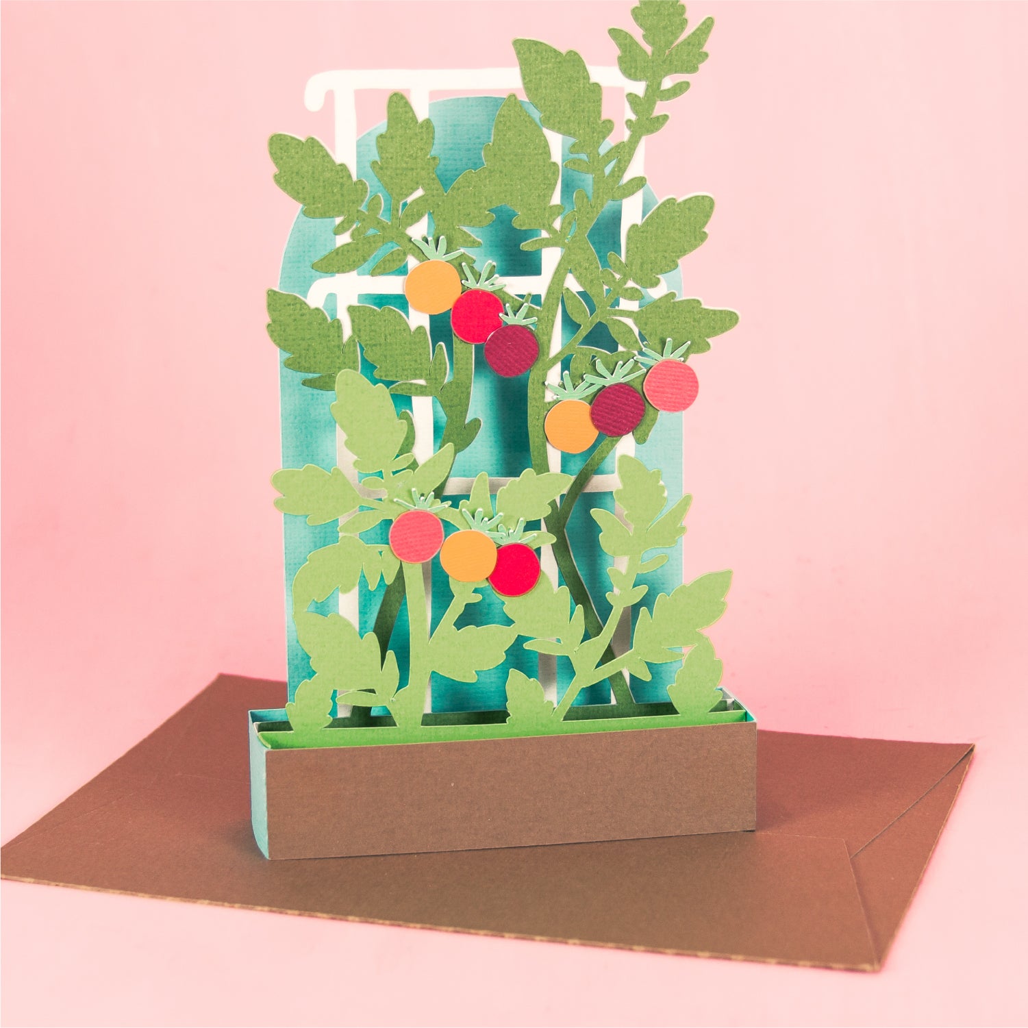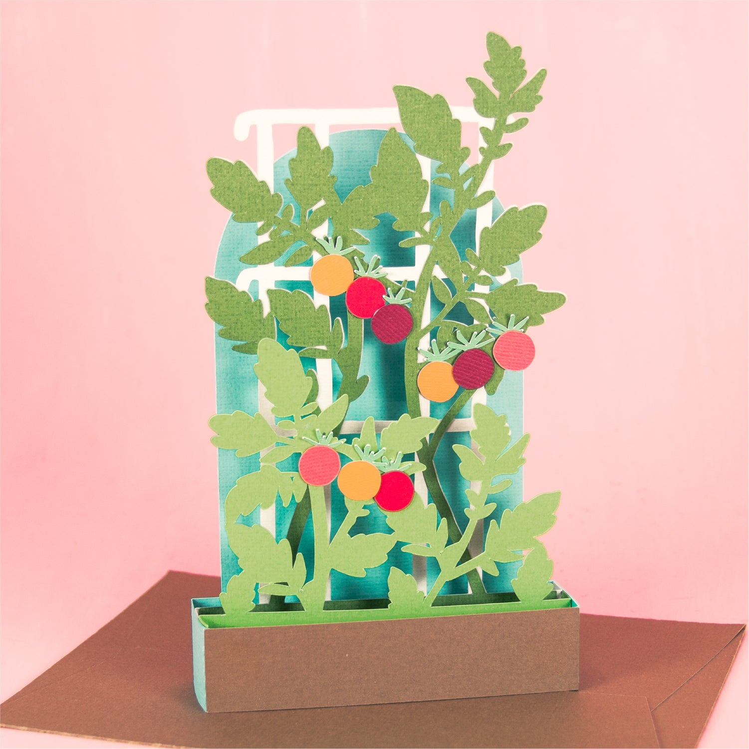 Create a fun bright card with this Cherry Tomato Trellis Card - a 3D summer Card SVG! Send to your favorite farmer's market shopper, or to a home gardener! Change the color of the tomatoes, or add paint to them for a more custom look. It's super easy to put together as well! This cutting file is perfect for Cricut and Silhouette cutting machines. The card folds flat for easy mailing and fits perfectly in the included 5x7” envelope cut file. Explore more of my designs for even more cute and creative ideas!