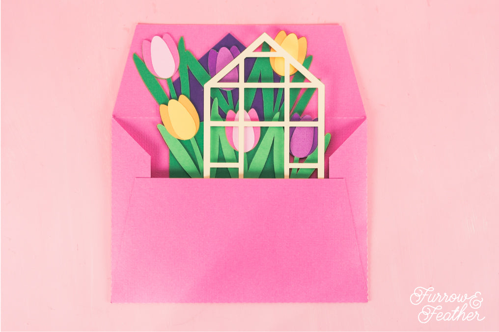 Create a beautiful spring card with this Tulip Greenhouse Card - a 3D spring & Easter Card SVG! I love this card for a baby shower, Mother's Day, or for your favorite gardener! It really works for any occasion. It's super easy to put together as well! This cutting file is perfect for Cricut and Silhouette cutting machines. The card folds flat for easy mailing and fits perfectly in the included 5x7” envelope cut file. Explore more of my floral card designs for even more cute and creative ideas!