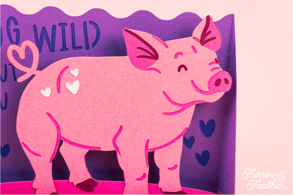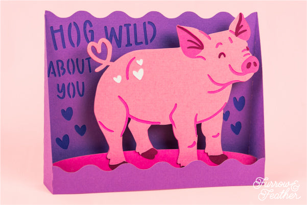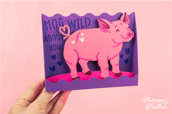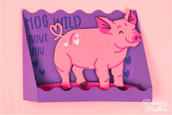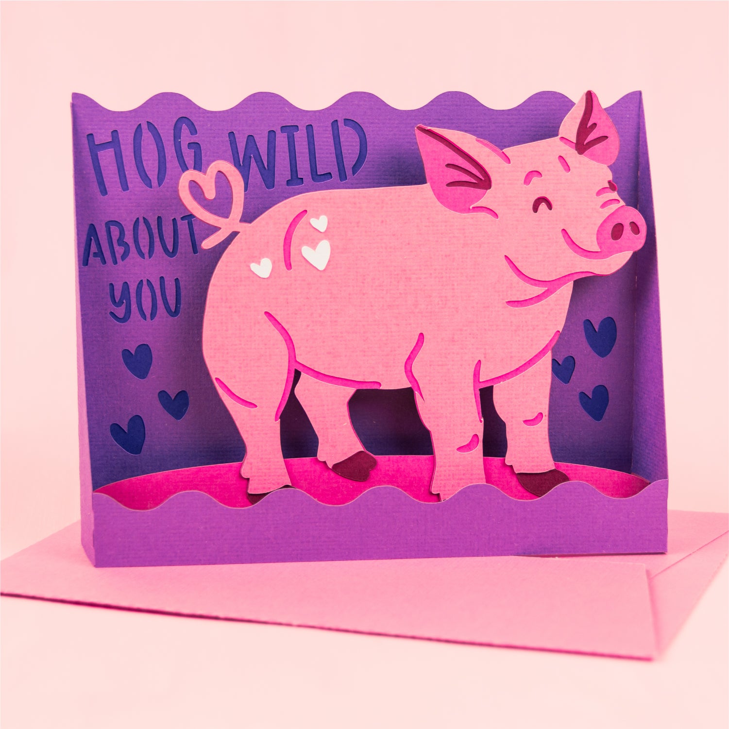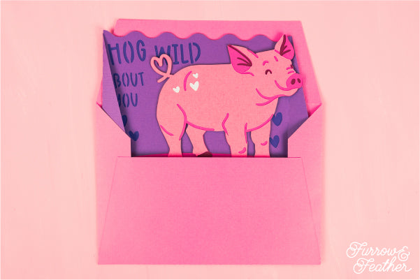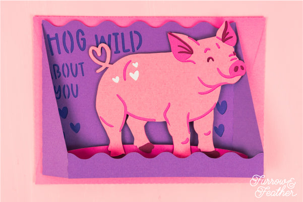 A super cute Valentine’s Day card, featuring a piggy! This card is super easy to assemble. Would work great for an anniversary as well. Folds flat to fit in the included 5x7” envelope cut file.