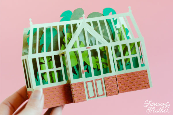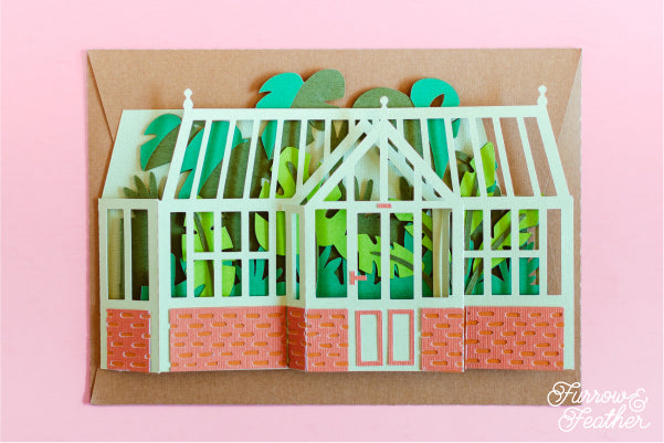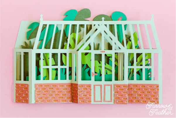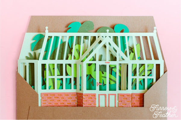 A classic victorian-era greenhouse card. This box card has two different pop out sections, giving it even more dimension! Folds flat to fit in the included 5x7” envelope cut file.