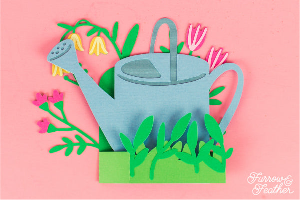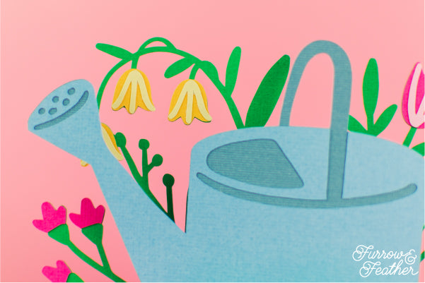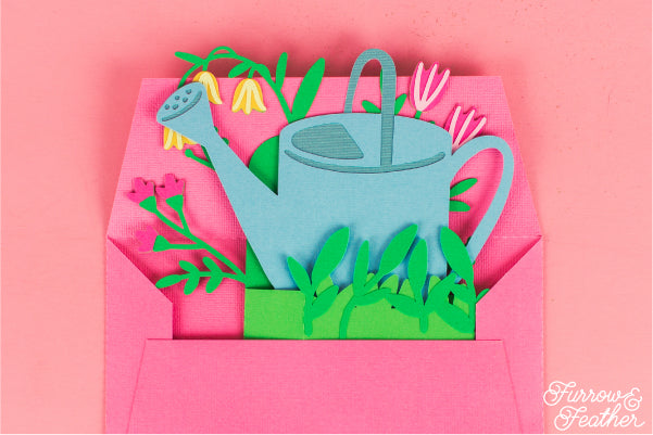 A super cute card for your favorite gardener! Works super well for spring or Easter too. Folds flat to fit in the included 5x7” envelope cut file.