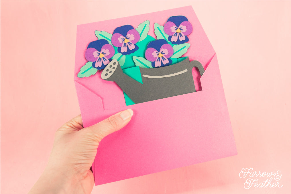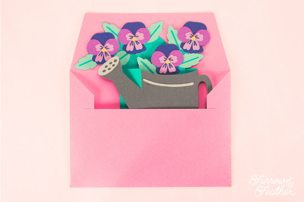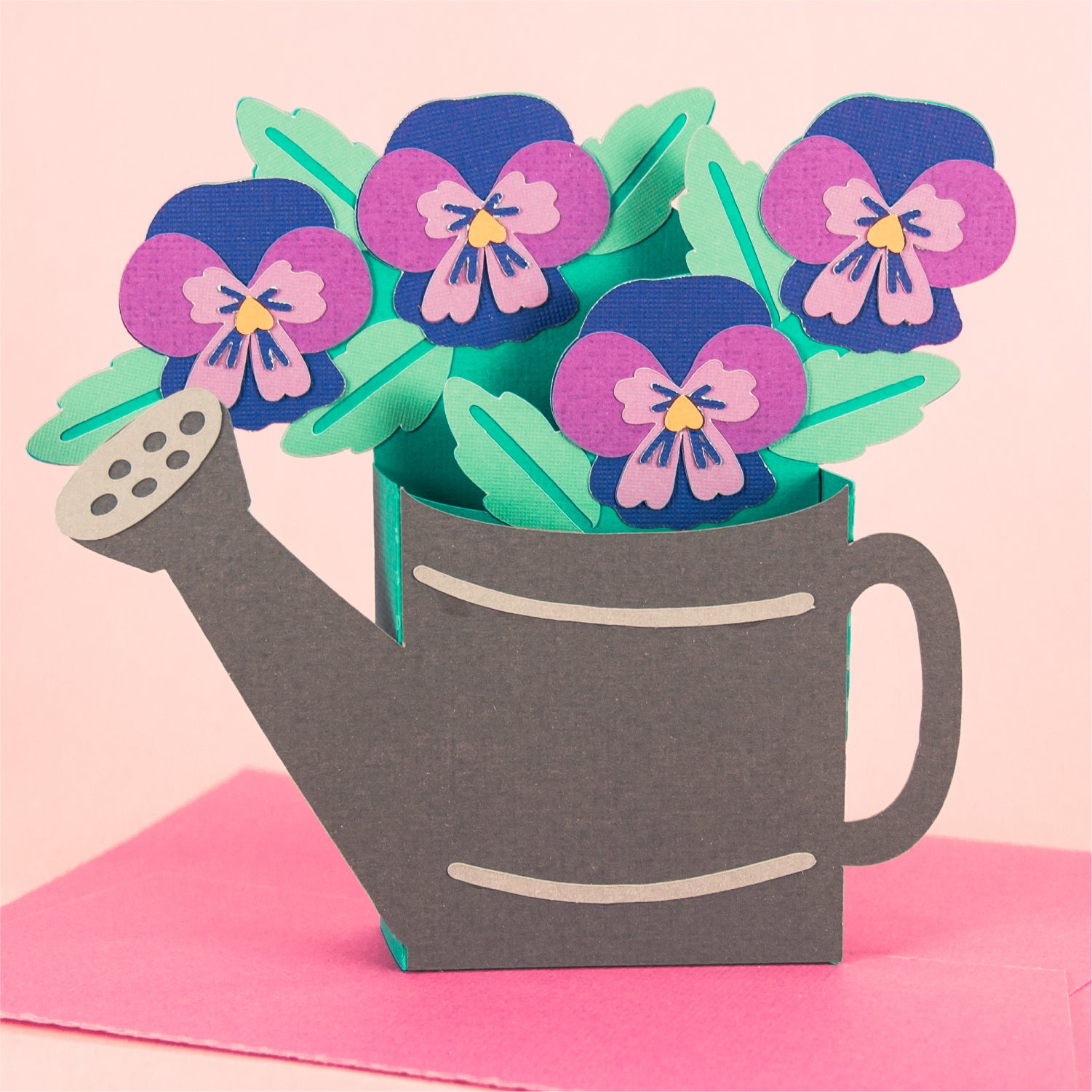 Create a beautiful spring card with this Watering Can with Pansies Card - a 3D spring & Easter Card SVG! I love this card for a baby shower, your favorite gardener, or for Mother's Day! It really works for any occasion. It's super easy to put together as well! This cutting file is perfect for Cricut and Silhouette cutting machines. The card folds flat for easy mailing and fits perfectly in the included 5x7” envelope cut file. Explore more of my floral card designs for even more cute and creative ideas!
