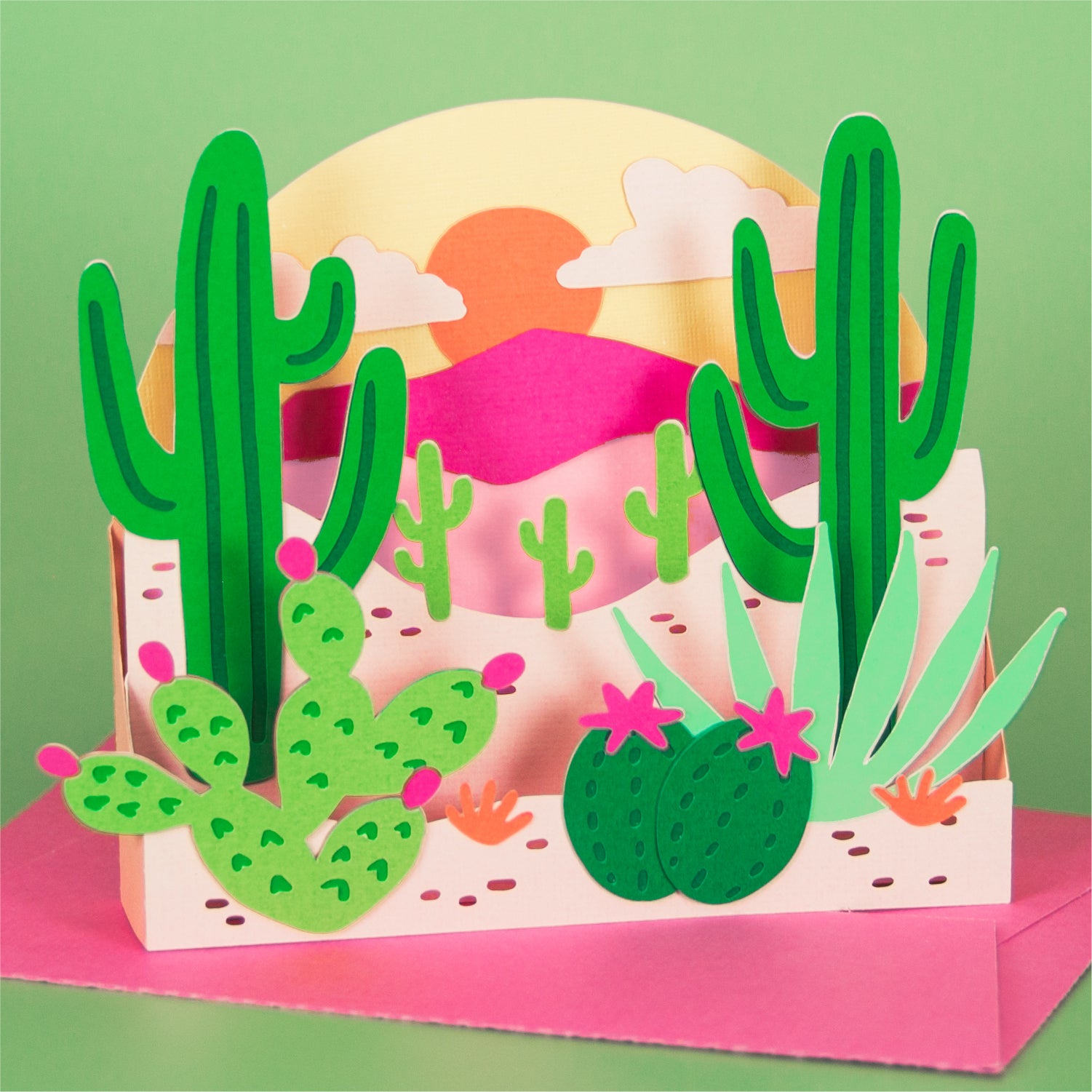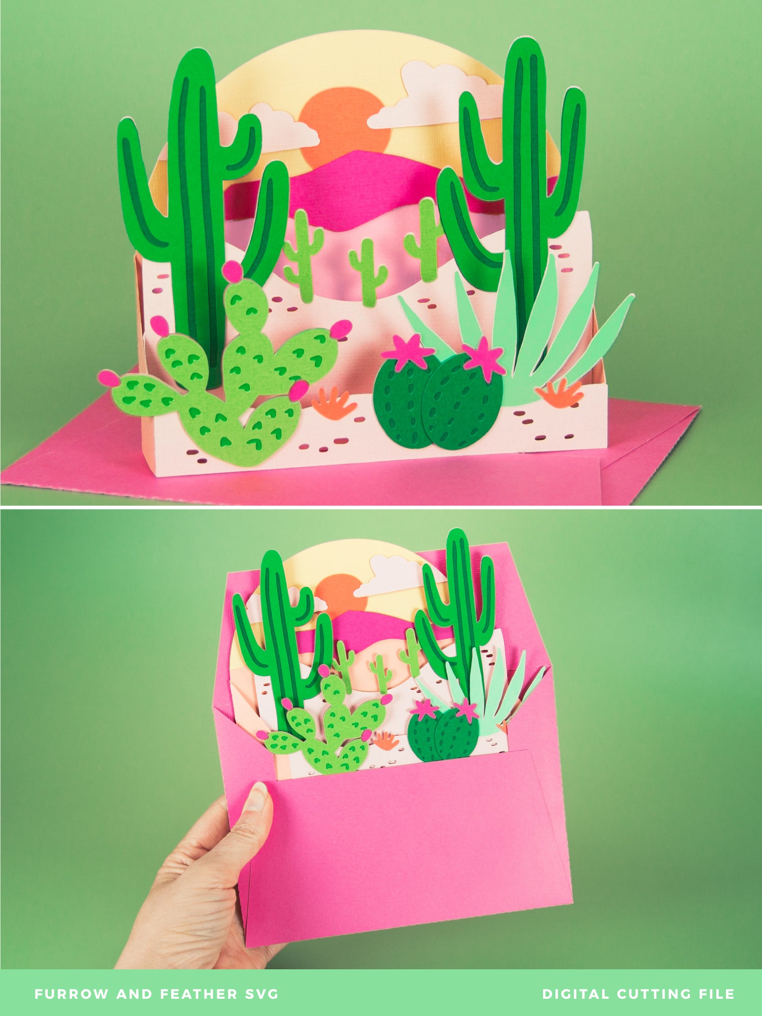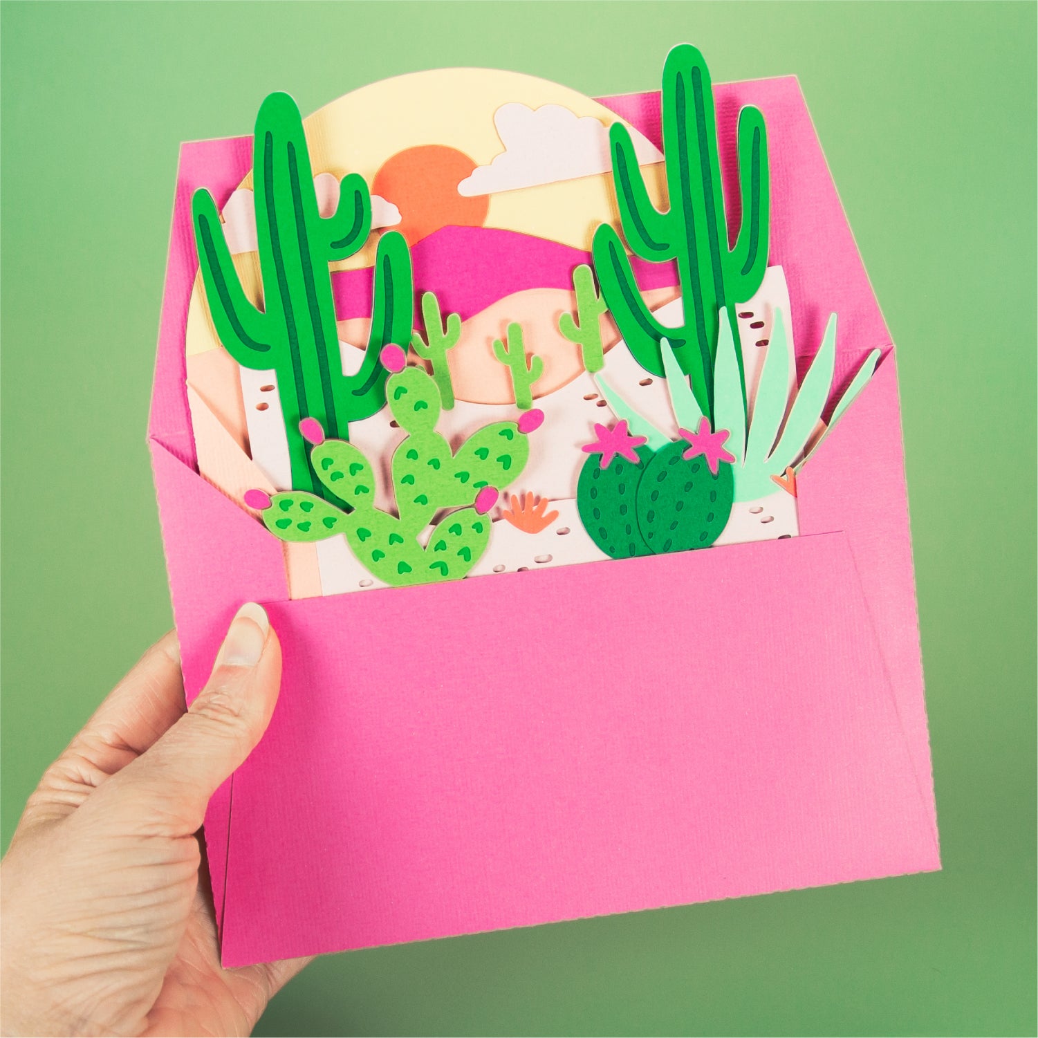 Create a gorgeous card with this Desert Scene Card - a 3D any occasion card SVG! This is a beautiful card for summer, a birthday, or as a thank you card. It really works for any occasion! Just add your own sentiment. This design features various cactus plants in a desert with a colorful sunset. This cutting file is perfect for Cricut and Silhouette cutting machines. The card folds flat for easy mailing and fits perfectly in the included 5x7” envelope cut file. Explore more of my card designs for even more cute and creative ideas!