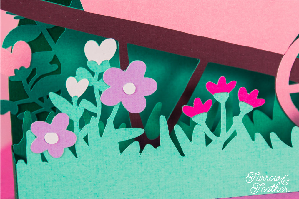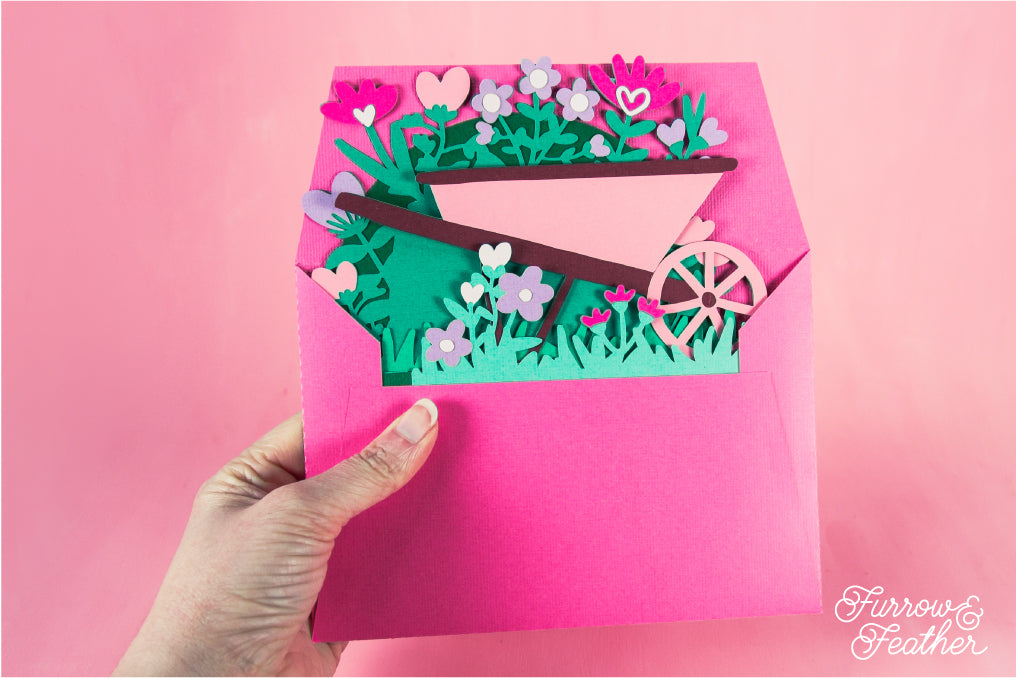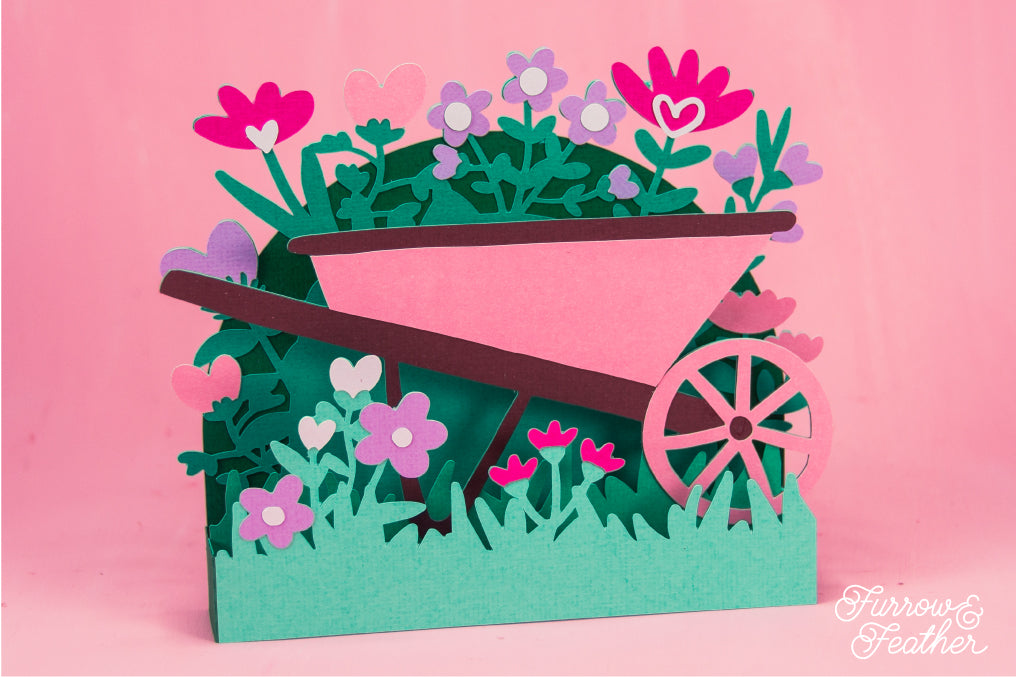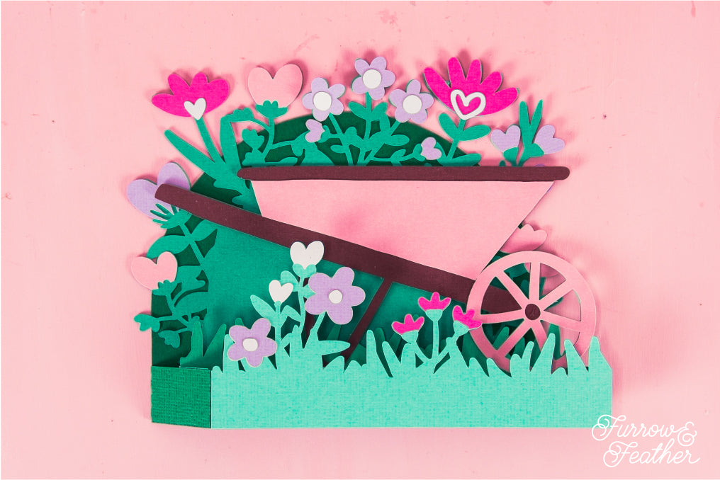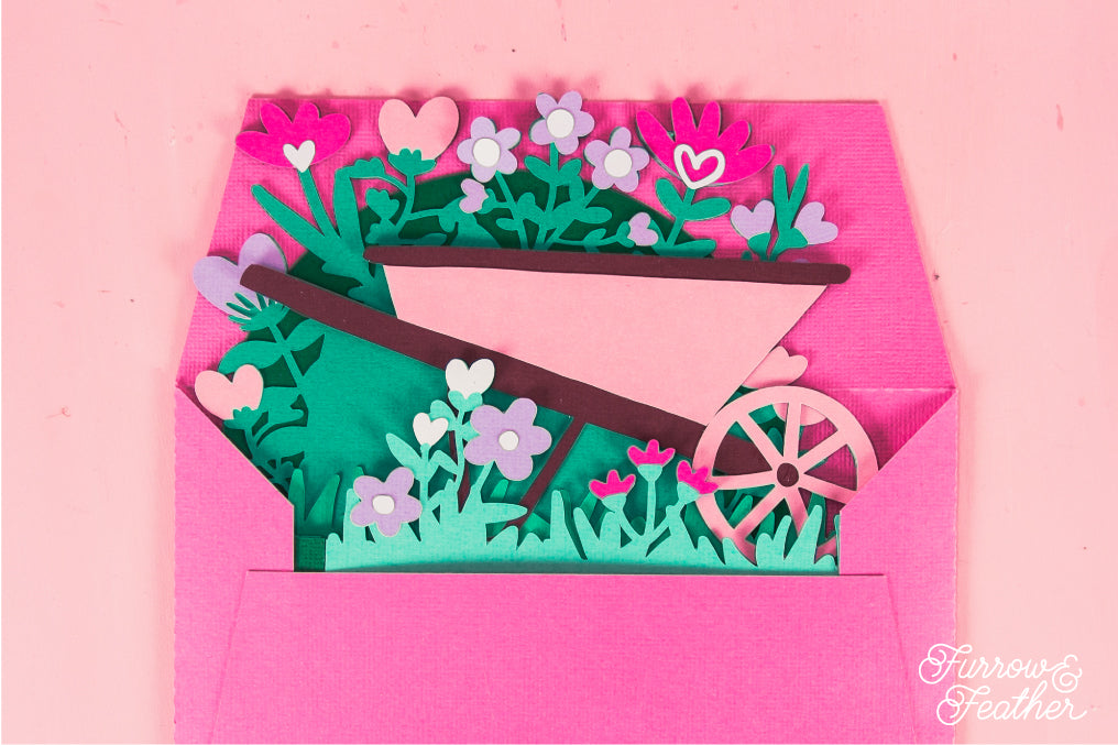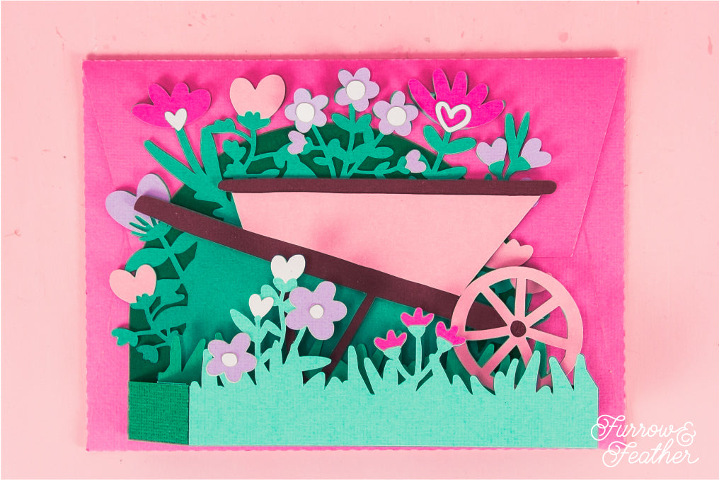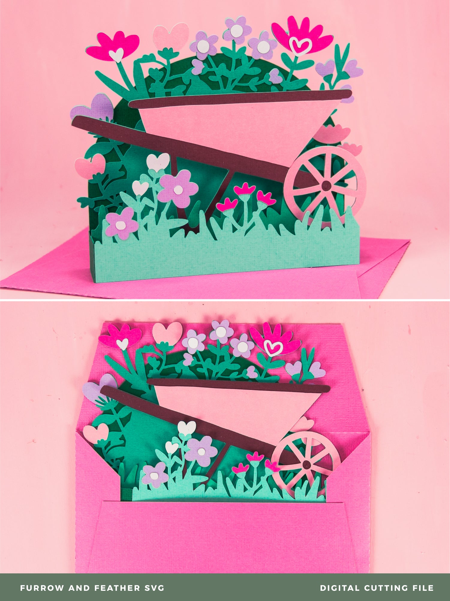 Create a super fun Valentine's Card with this Valentine's Day Wheelbarrow with Heart Flowers Card SVG! This card would also work great for other occasions, simply add your own sentiment! Featuring a wheelbarrow and wildflowers, this card is perfect for Cricut and Silhouette cutting machines. This design folds flat for easy mailing and fits perfectly in the included 5x7” envelope cut file. Explore more of my Valentine's Day card designs for even more cute and creative ideas!