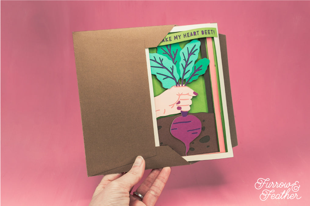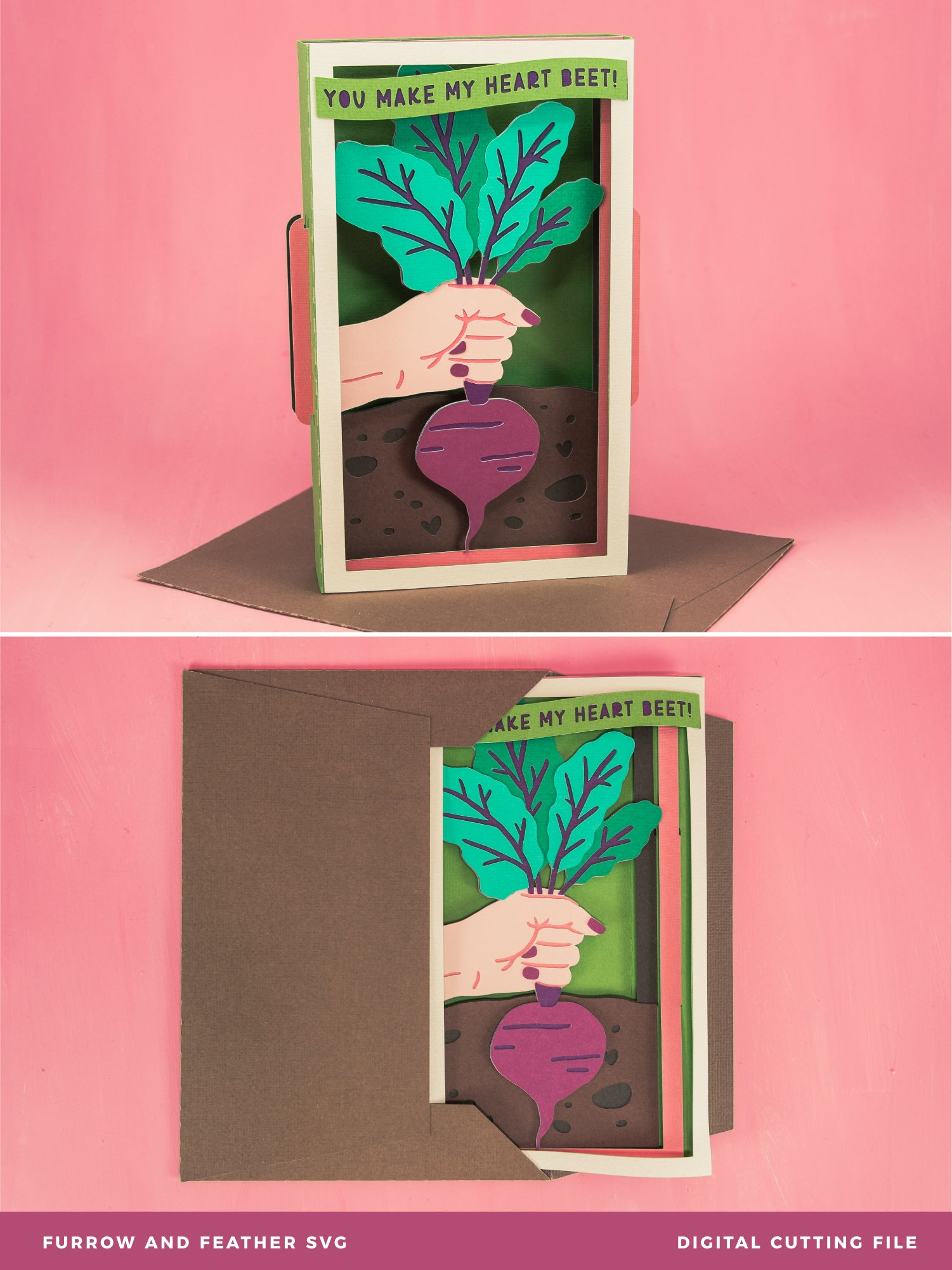 Create a punny Valentine's Card with this Valentine’s Day 'You Make My Heart Beet' card SVG file! This card is perfect for your favorite gardener! This card works great with Cricut and Silhouette cutting machines. The card folds flat for easy mailing and fits perfectly in the included 5x7” envelope cut file. Explore more of my Valentine's Day card designs for even more cute and creative ideas!
