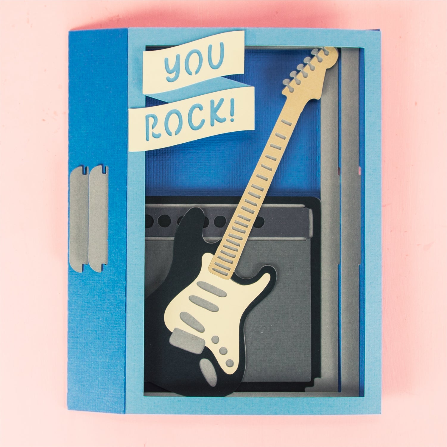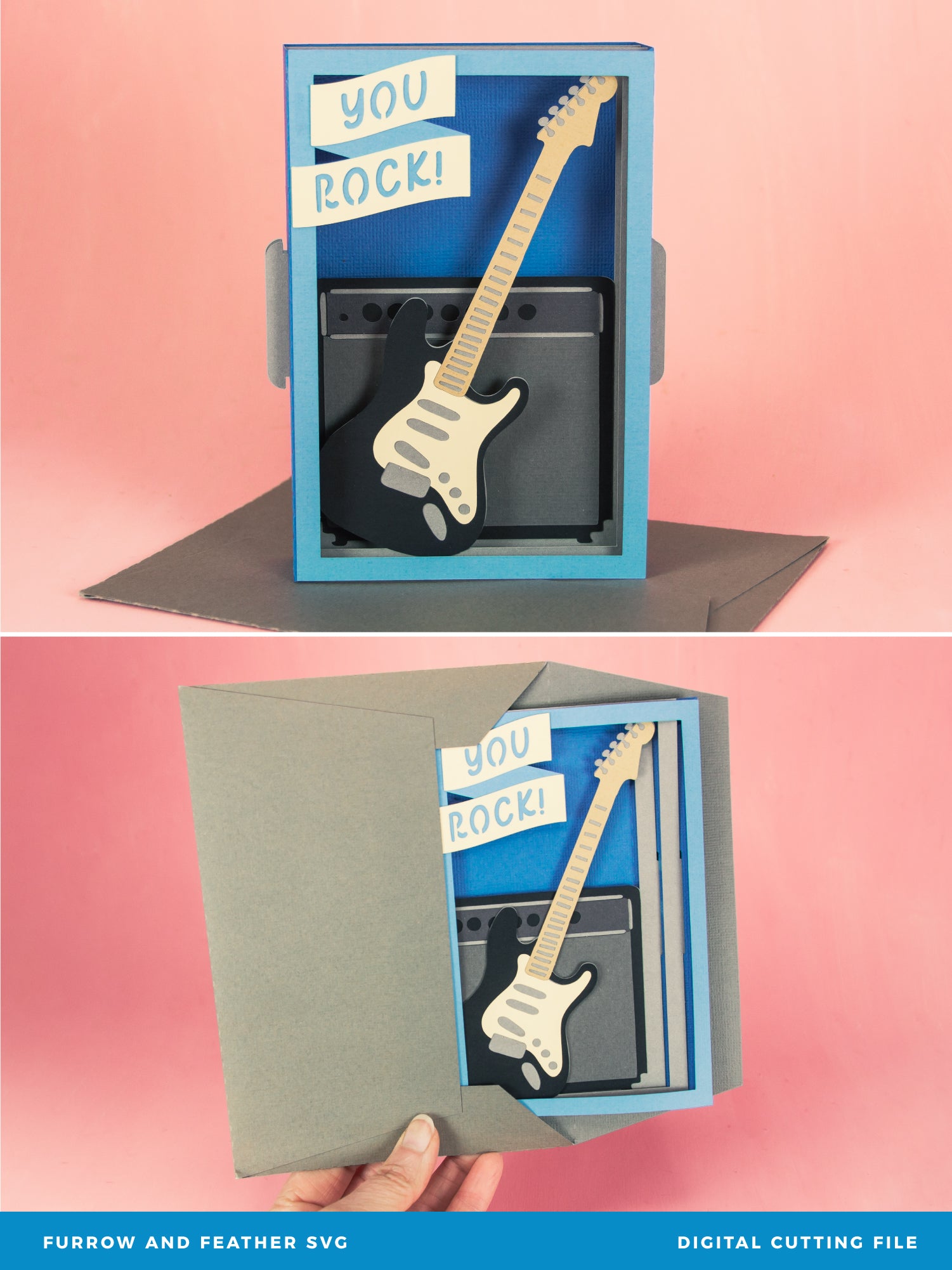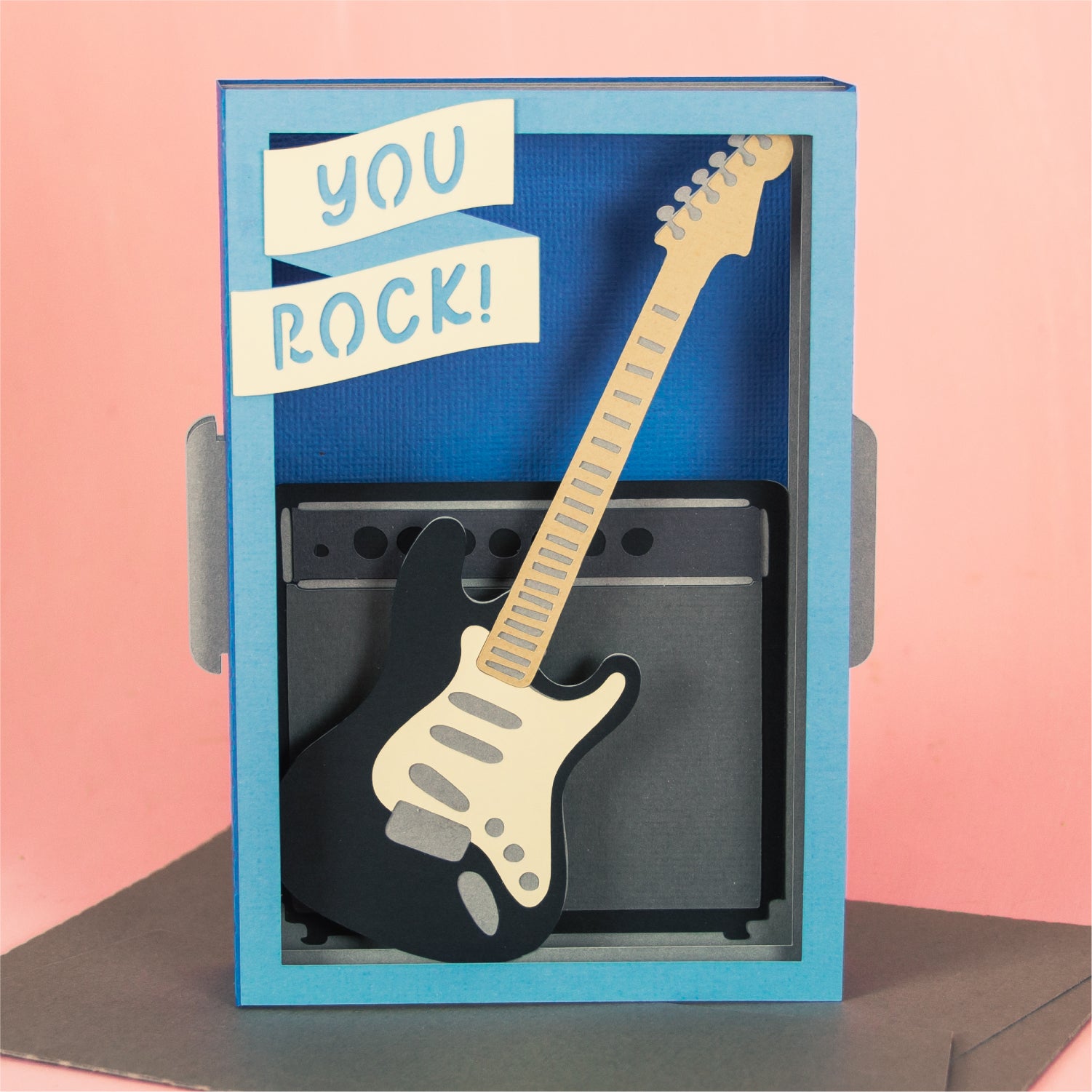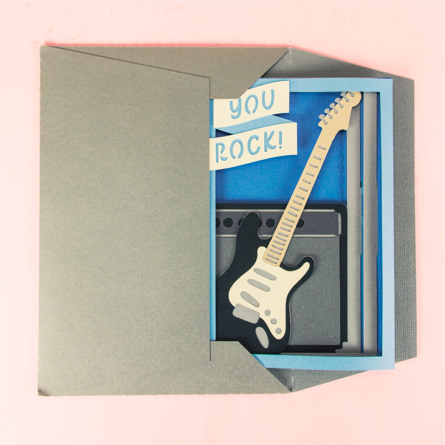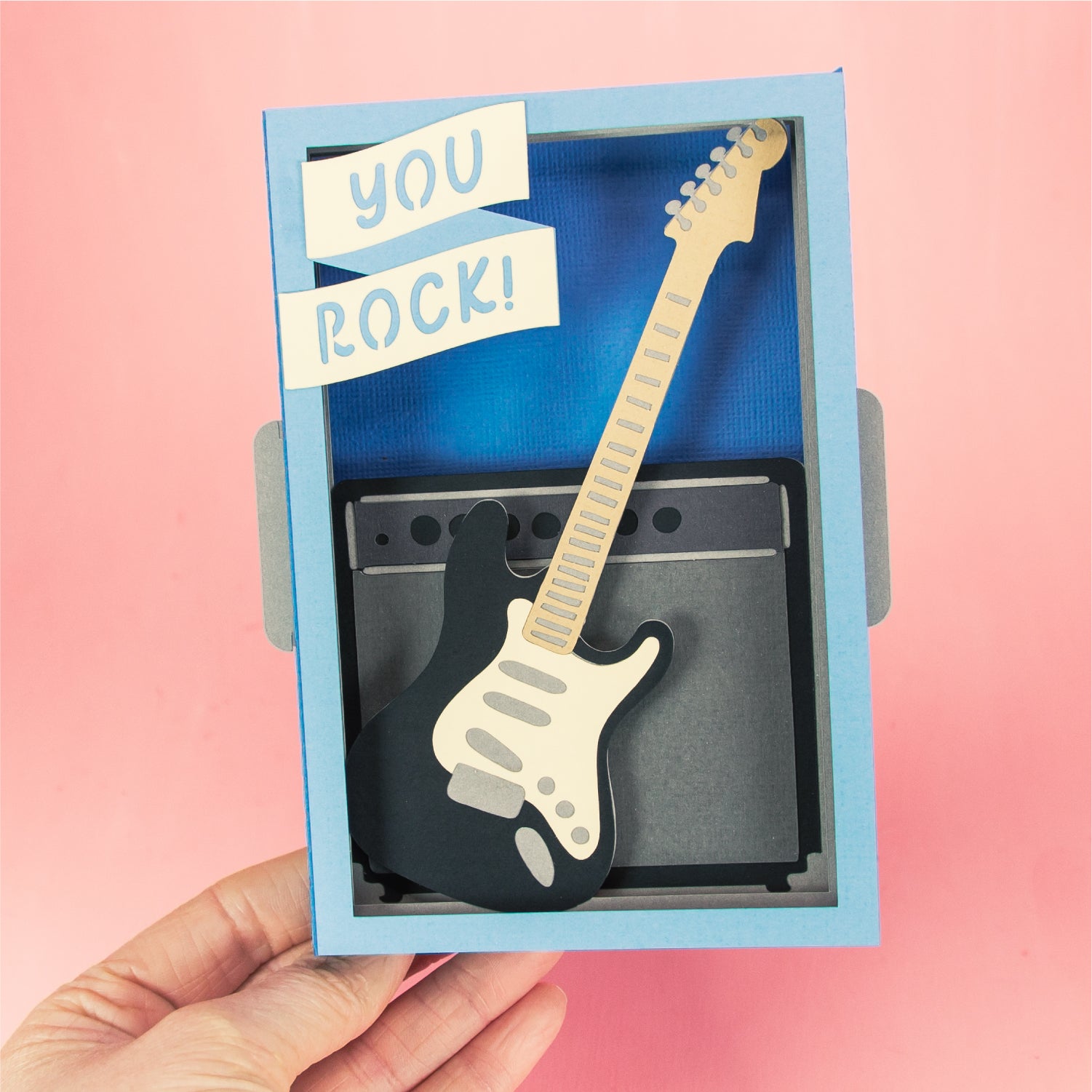 Create a super fun card for your favorite guitarist with this You Rock! Guitar Card - a 3D musician card SVG! This is such a easy card for a birthday, father's day, or as a just because card. This design features an electric guitar and amp. This card is super easy to put together. I love updating the colors of the body of the guitar to match the recipients guitar! I also like to change the color of the background and front pieces. This cutting file is perfect for Cricut and Silhouette cutting machines. The card folds flat for easy mailing and fits perfectly in the included 5x7” envelope cut file. Explore more of my card designs for even more cute and creative ideas!