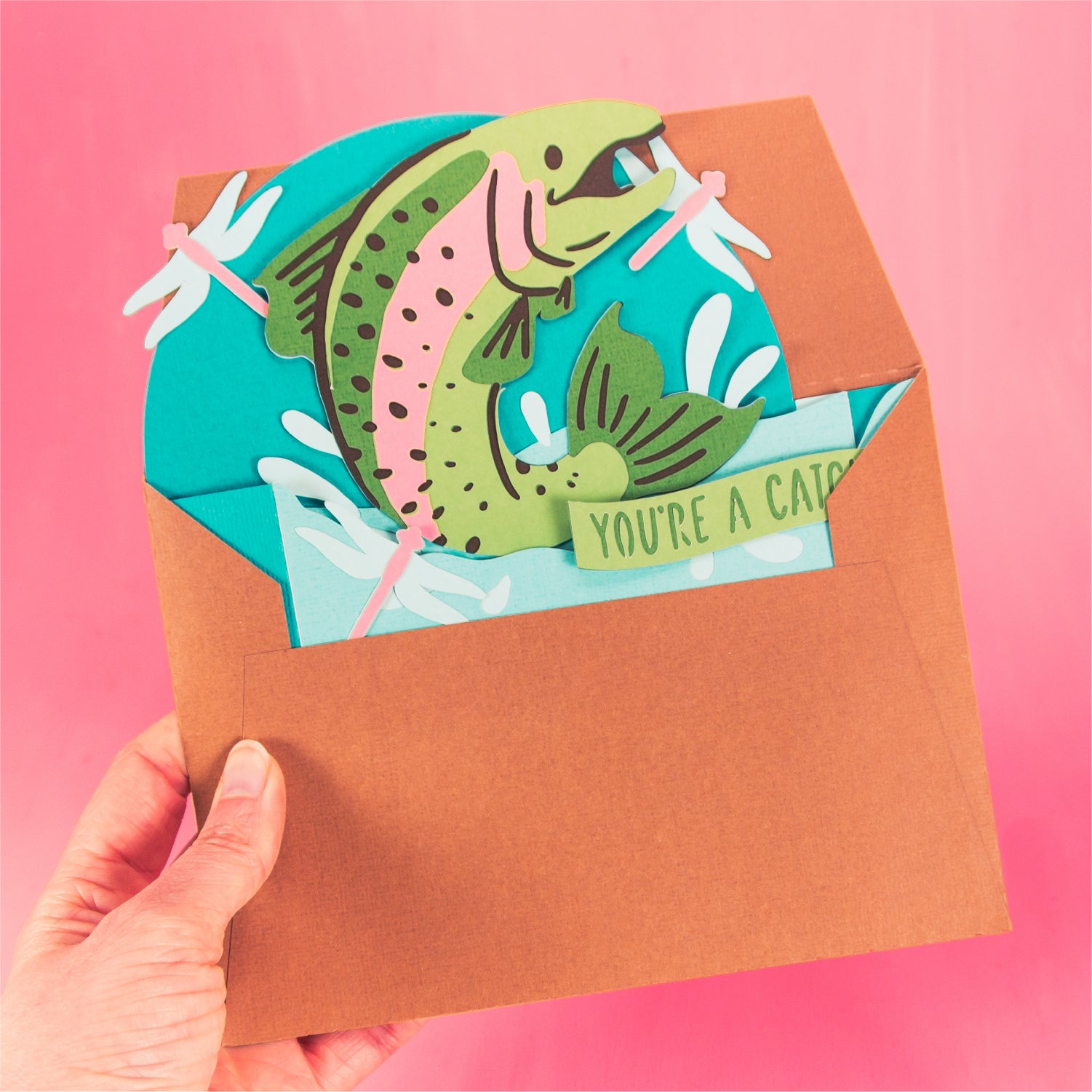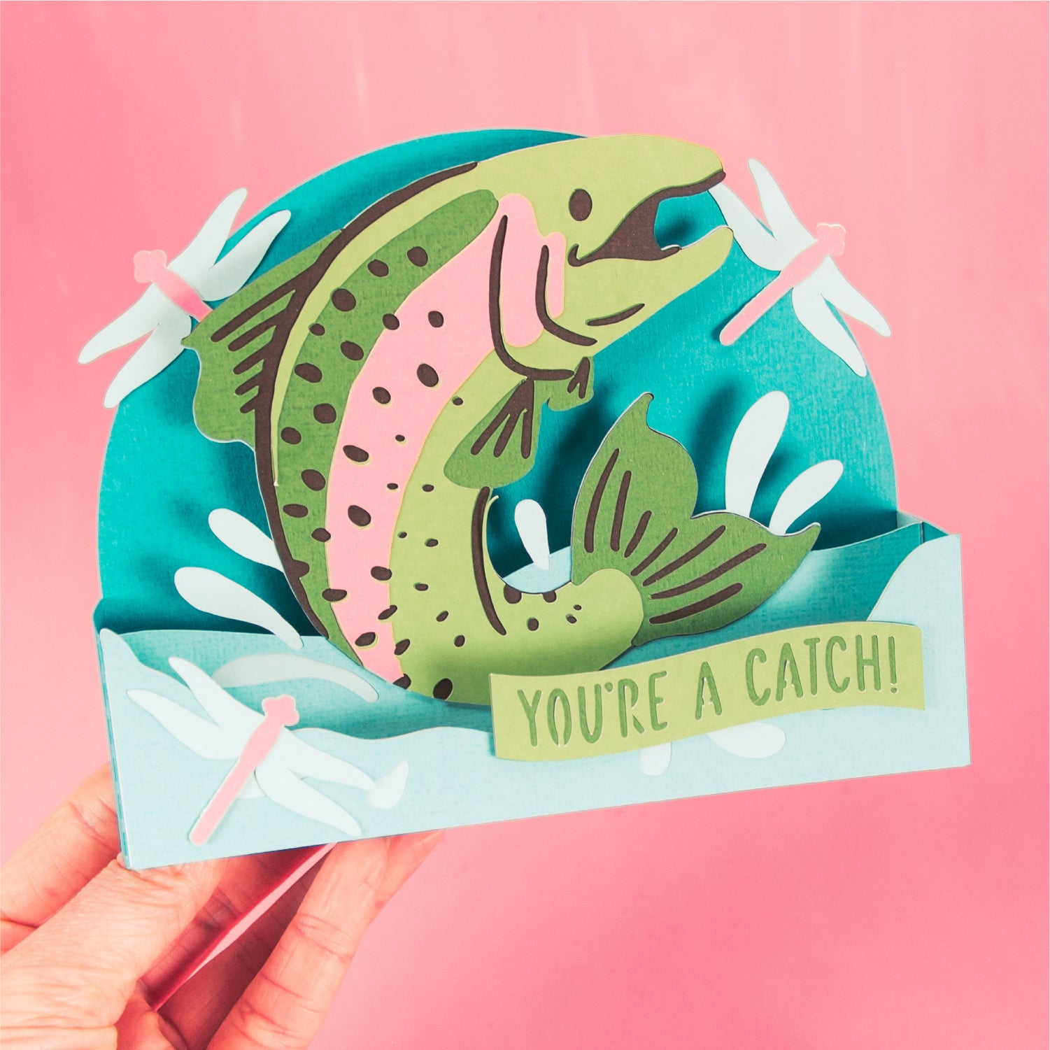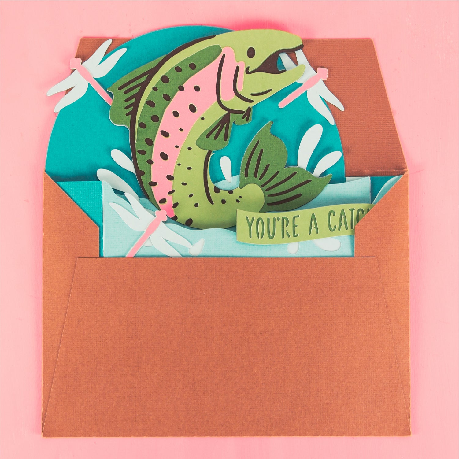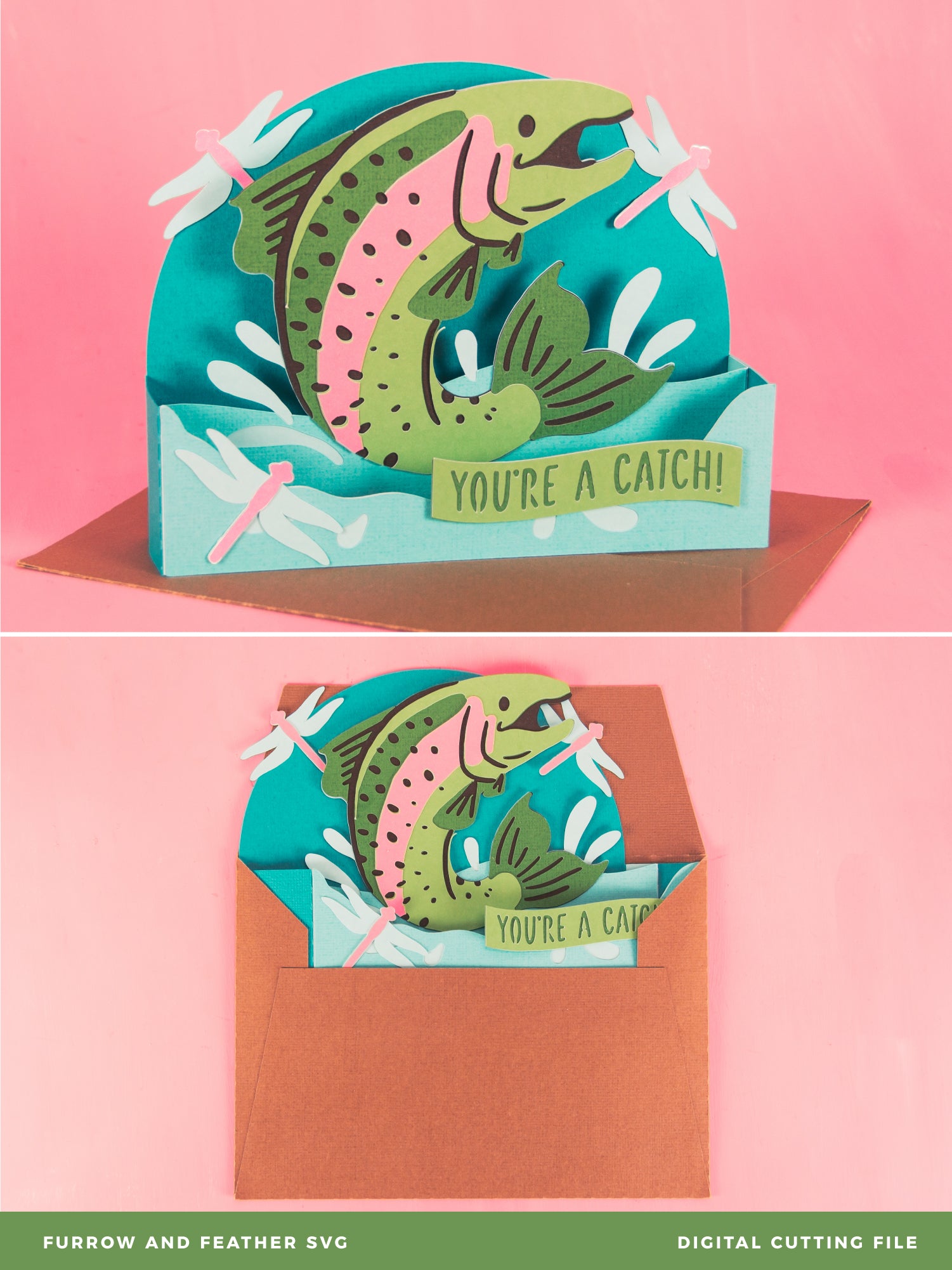 Create a super fun card for Father's Day with this You're a Catch - Fishing Card - a 3D Father's Day card SVG! This is such a fun card for Father's Day, Valentine's Day, or a birthday card. This design features a colorful rainbow trout and some dragonflies. This cutting file is perfect for Cricut and Silhouette cutting machines. The card folds flat for easy mailing and fits perfectly in the included 5x7” envelope cut file. Explore more of my card designs for even more cute and creative ideas!