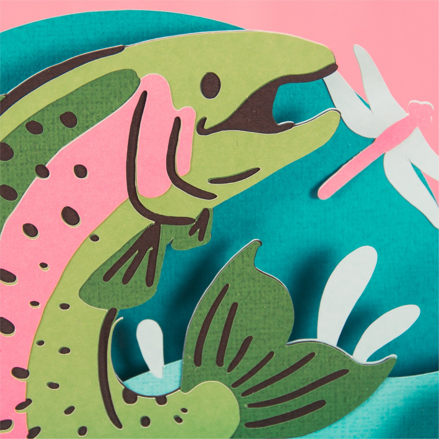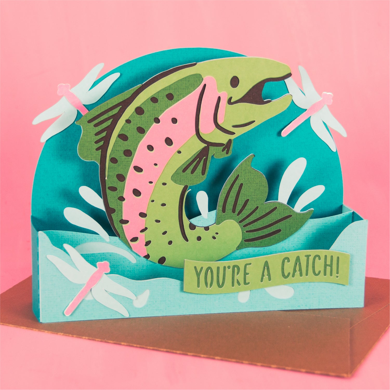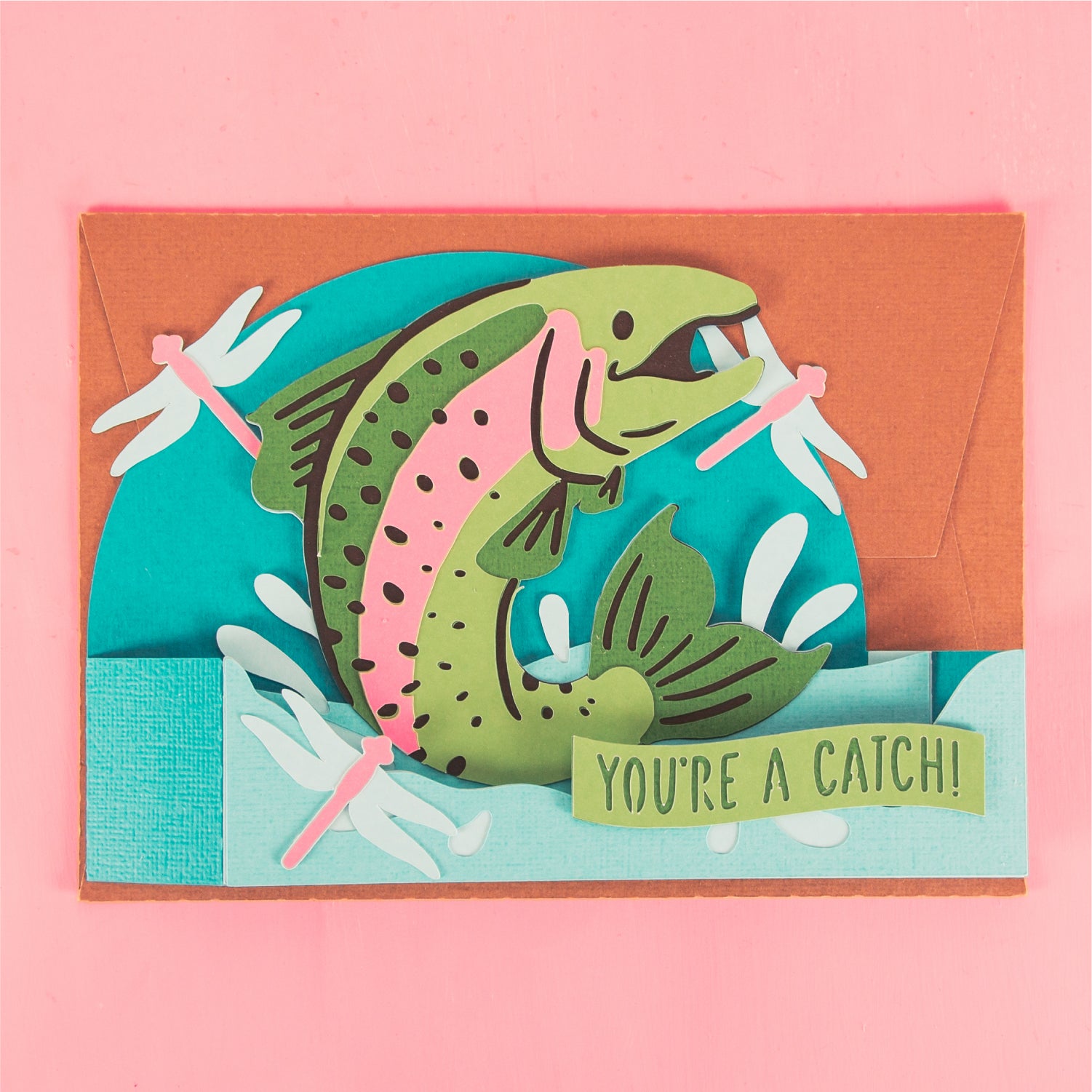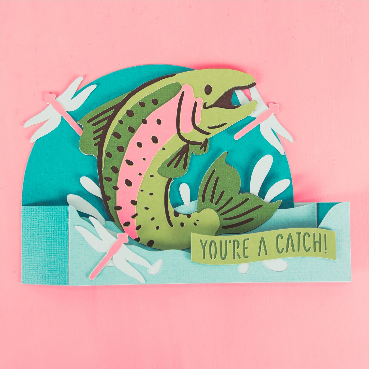 Create a super fun card for Father's Day with this You're a Catch - Fishing Card - a 3D Father's Day card SVG! This is such a fun card for Father's Day, Valentine's Day, or a birthday card. This design features a colorful rainbow trout and some dragonflies. This cutting file is perfect for Cricut and Silhouette cutting machines. The card folds flat for easy mailing and fits perfectly in the included 5x7” envelope cut file. Explore more of my card designs for even more cute and creative ideas!