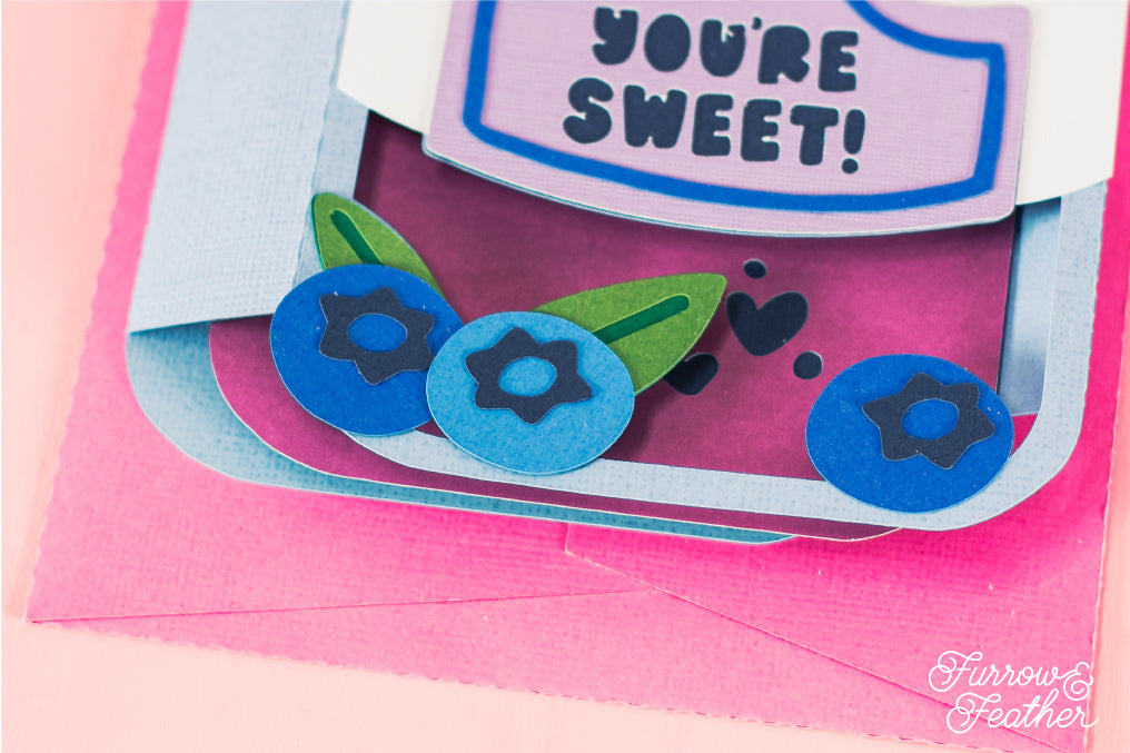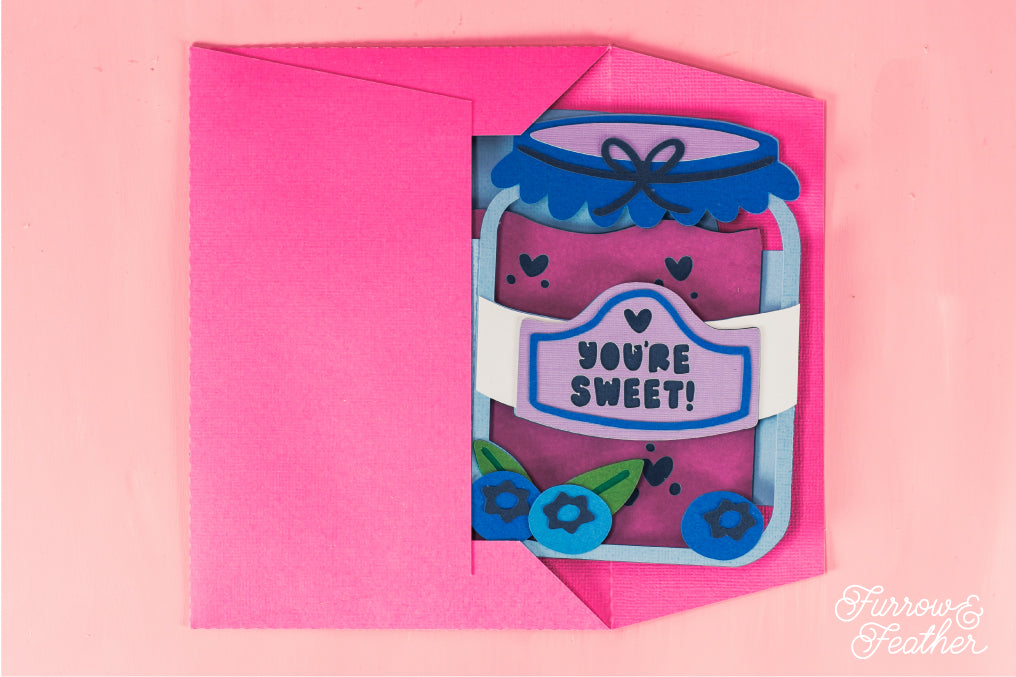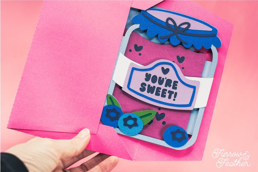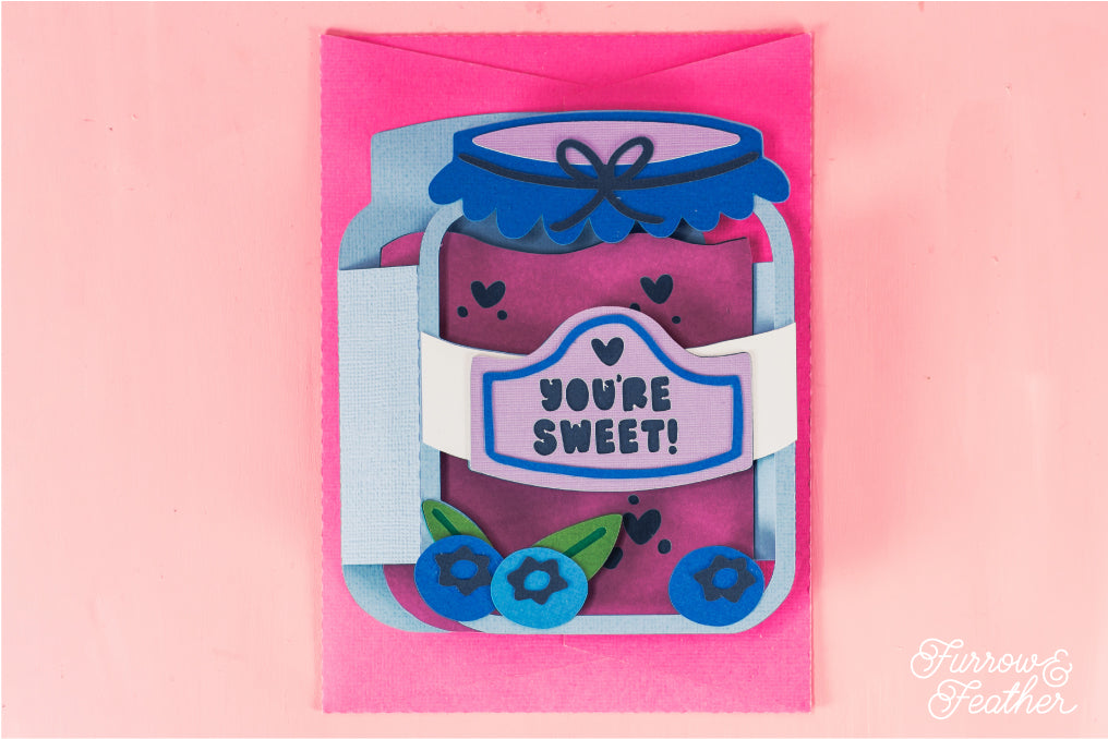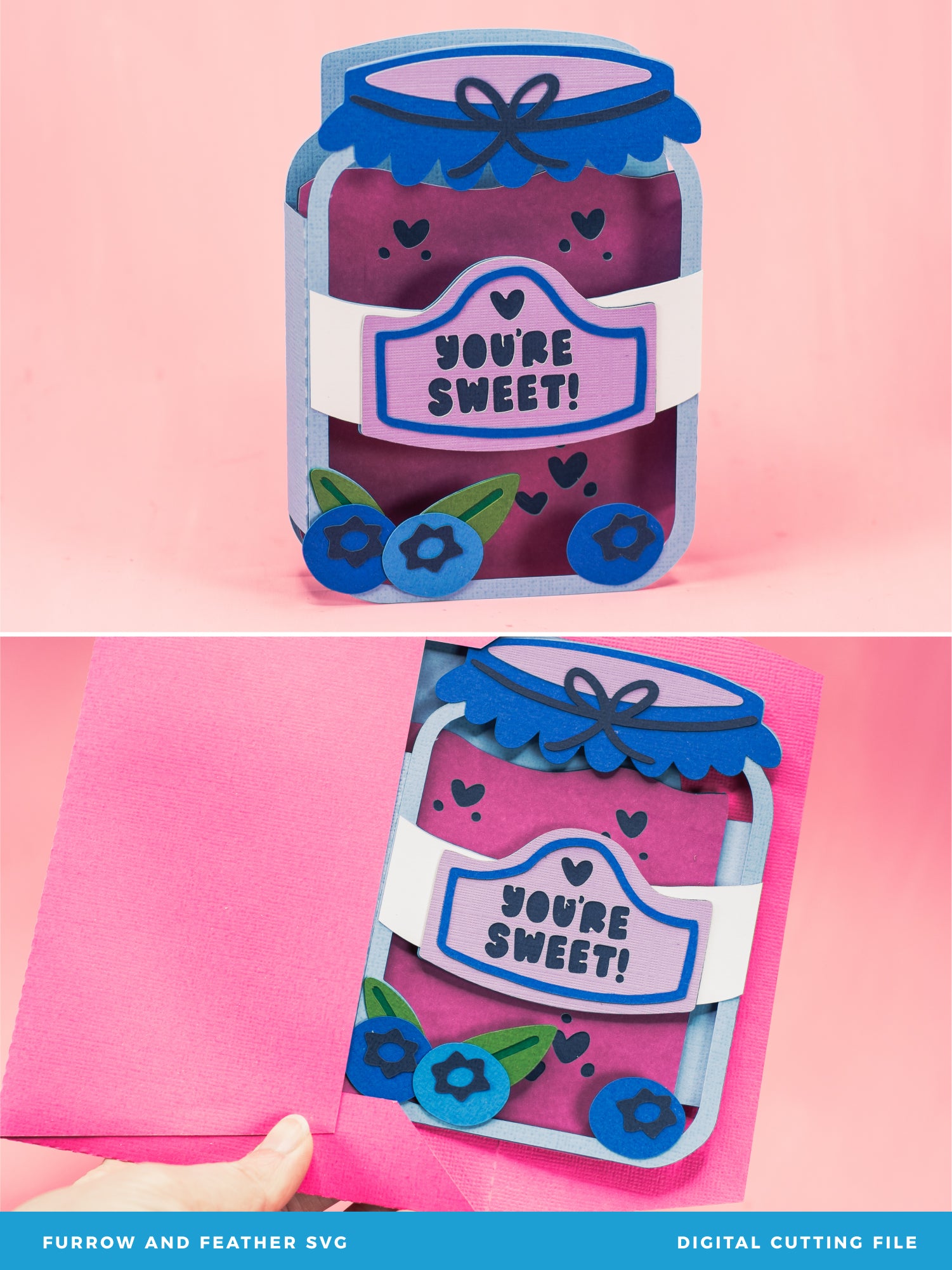 Create an adorable Birthday Card with this You're Sweet! - Blueberry Jam Jar - Birthday Card SVG! Featuring a jar of blueberry jam, and some blueberries in the front, this cutting file is perfect for Cricut and Silhouette cutting machines. This card would also work great for Valentine's Day. The card folds flat for easy mailing and fits perfectly in the included 5x7” envelope cut file. Explore more of my Birthday Day card designs for even more cute and creative ideas!